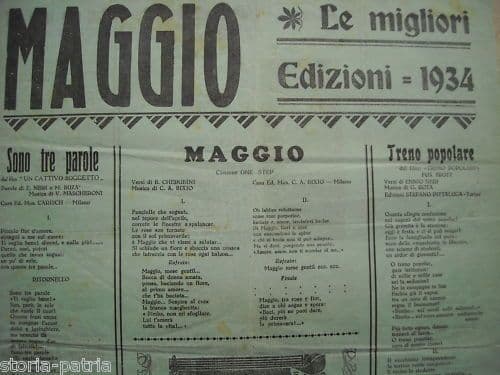 Maggio *Le Migliori Edizioni* *1934* Interessante antica locandina pubblicitaria, formato manifesto, con stampati i testi di alcune canzoni ballabili: *Maggio: one step (Cherubini-Bixio; ediz. Bixio, Milano)* *Treno popolare: fox trott (Neri-Rota; ed. Pittaluga, Torino)* *Signorinetta: tango (Jurmann-Kaper; ed. Pittaluga, Torino)* *Sono tre parole: dal film "Un cattivo soggetto" (Neri-Buzà, musica di Mascheroni; ed. Carisch, Milano)* *Glu' glu': slow fox (Neri-Ranzato; ed. Pittaluga)* *Muraglie: Frati-Raimondo, ed. Raimondo MI* *Chitarra muta: Eldo Di Lazzaro; ed. Melodi, Milano* *Kay-dadà!?: canzone one step (Bruno-Rusconi; ed. Melodi, Milano)* *Io con te, tu con me...: Galdieri-Caslar; ed. Curci* *Non chieder troppo all'amor: Neri-Bonavolontà; ed. Carisch, Milano* *Sono come tu mi vuoi: Cherubini-Bixio; ed. Bixio* *Valzer delle viole: Bracchi-D'Anzi; ed. Curci* *Ogni lacrima un sorriso: canzone tango, dal film "Il caso Haller" (Cherubini-Bixio)* *Luna, sei stata tu: Borella-Mariotti* manifesto di grandi dimensioni, misura circa cm. 49x35 (l'intero foglio), impresso al recto e al verso, con anche due illustrazioni nel testo; edizioni Campi (Foligno), 1934 Di interesse musicale, collezionistico, decorativo Modesta conservazione generale, segni e difetti d'uso e d'epoca, piegature e sgualciture e difetti vari e strappetti marginali; diffuse fioriture o macchie varie di ossidazione; esemplare in carta molto leggera, di colore verde, il tutto così come dalle immagini allegate; **meritevole anche di essere inserito sotto passpartout ed incornciato.** *(le immagini allegate raffigurano particolari dell'intero foglio, eventuali ulteriori informazioni a richiesta)* [](https://img861.imageshack.us/i/maggio9aa.jpg/) [](https://img805.imageshack.us/i/maggio9b.jpg/) [](https://img832.imageshack.us/i/maggio9c.jpg/) [](https://img6.imageshack.us/i/maggio9e.jpg/) [](https://img7.imageshack.us/i/maggio9f.jpg/) [](https://img831.imageshack.us/i/maggio9l.jpg/)