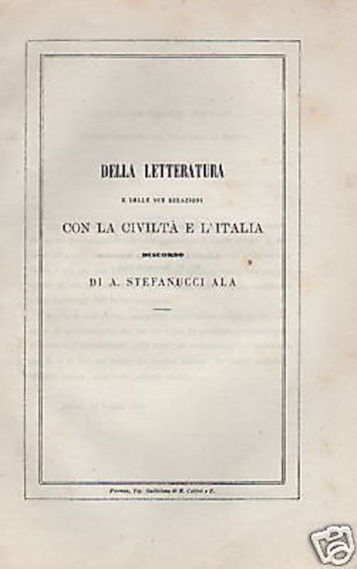 **STEFANUCCI ALA A.** DELLA LETTERATURA E DELLE SUE RELAZIONI CON LA CIVILTA' E L'ITALIA Firenze,Galileiana, 1863. Cm.22, pp.13, s.l. Interessante antica relazione sulla necessità degli studi letterari; opera indirizzata al dr. Giuseppe Girolami, direttore del manicomio di Pesaro. DI INTERESSE CULTURALE E BIBLIOGRAFICO Buona conservazione generale, segni e difetti d'uso e d'epoca, sparse fioriture, esemplare senza copertine o legature ma con semplice brossura moderna.