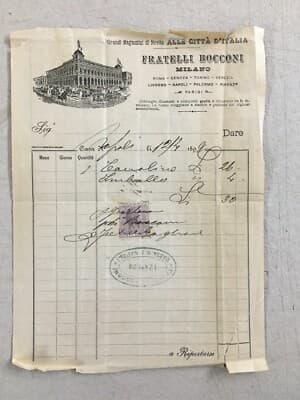 **Chocolat Instantané François-Meunier**, *Milano* - *Parigi*. Edizione d'epoca con grafica pubblicitaria a colori raffigurante una fata intenta a preparare una tazza di cioccolato. La figura allegorica indossa un abito decorato con i marchi di fabbrica originali della ditta dolciaria. * **Soggetto**: Pubblicità cioccolato Meunier con figura di fata. * **Dimensioni**: 40x29 cm circa. * **Supporto**: Stampa su carta leggera a colori. * **Contenuto aggiuntivo (verso)**: Inserzioni per **Fabbriche Telerie Frette** (*Monza*) e **Automobili Bianchi** (*Milano*), completa di immagine di autovettura d'epoca. * **Provenienza**: Illustrazione tratta da pubblicazione periodica, databile 1914 circa.