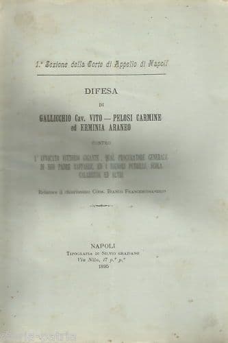 (Carlo Gargiulo - Salvatore Rosa) Difesa di Gallicchio cav. Vito - Pelosi Carmine ed Erminia Araneo contro l'avvocato Vittorio Gigante, qual procuratore generale di suo padre Raffaele, ed i signori Petrilli, Scola, Calabrese ed altri Relatore il chiarissimo cons. Bianco Francescosaverio Napoli, Graziano, 1895 Cm.26,5; pp. 28; bross. edit. (difetti) Interessante edizione originale antica e d'epoca, allegazione giuridica a cura degli avvocati napoletani Carlo Gargiulo e Salvatore Rosa, memoria esposta alla prima sezione della Corte di Appello di Napoli, in difesa di alcuni cittadini di Vallata, chiamati in giudizio per rispondere di usurpazione di terreni demaniali rientranti nel territorio di Trevico (Avellino); dissertazione molto interessante sia dal punto di vista giuridico sia per i riferimenti e la storia locale di paesi dell'Irpinia, al confine con la Puglia, con citazione di eventi, località e personaggi vari, tra cui rileviamo riferimenti al *Feudo e Bosco di S. Pietro, Montagna Comunale, vigne e castagneti detti di S. Lorenzo, Lutarelli o Santa Marena, Molino dell'Oliva, Civita o Taverna delle Noci, Mattini e S. Giuseppe, Serra di Guardiola, o Guardio, Agrifoglio, Costa Scavonica o Molini di Friddi, Lutarelli o Coccia di Mare, Porta di Fontana, ...* *Finita o Vadognica, Serra Lunga o Costa della Ienna, Bosco di Contra, Ischia dell'Arruobbo o Scampitella, Saccarda o Valle Saccarda, Demanio La Montagna,...* *tribunale di Ariano, sig. Pagliarulo, Mastrangelo, Pelosi, Gallicchio, Petrilli, Araneo, ...* con anche riferimenti alla esosità dell'avv. Gigante, e ad altre questioni specialistiche giurisdizionali ovviamente di complicata sintesi. Di interesse storico-locale giuridico bibliografico Buona conservazione generale, segni e difetti d'uso o d'epoca, sparse fioriture e annotazioni, difetti marginali a qualche pagina e alle copertine con strappetti o piccole rotture marginali e al dorso, ma complessivamente edizione ben conservata e di gustosa lettura.
