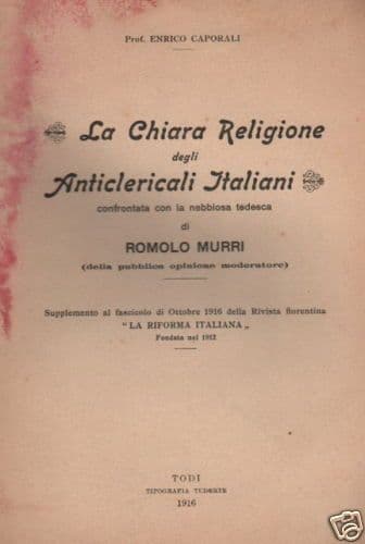 Enrico Caporali La chiara religione degli anticlericali italiani *confrontata con la nebbiosa tedesca di Romolo Murri* *(della Pubblica Opinione moderatore)* ..... Todi, Tip. Tuderte, 1916 Cm. 24, pp. 19, senza legatura. Interessante edizione d'epoca, *in cui l'autore -dalla sua villa di Todi- indirizza una polemica lettera aperta a Romolo Murri sul tema specialistico di religione e anticlericalismo, con riferimenti alla scienza matematica e fisica, alla biologia, alla fisiologia dei sensi, alla psicologia e sociologia, alla filosofia scientifica,...* *con un capitolo su "i Maestri del Murri" e sulla "sua religione nebbiosa".* Di interesse specialistico culturale bibliografico *raro, solo pochi esemplari noti nel sistema bibliotecario nazionale* Modesta conservazione generale, segni e difetti d'uso o d'epoca, sparse fioriture e gore colorate probabilmente per una originaria vecchia brossura rossa ora non più presente, e pertanto opera slegata e meritevole di rilegatura.