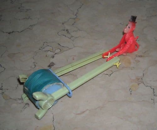 Simpaticissimo giocattolo d'epoca raffigurante una graziosa scimmietta, con un cappello (o tuba) in testa, tesa con elastici su due supporti, scimmia circense e acrobata, che salta tra i due supporti ed esegue capovolte, azionata dall'avvolgimento meccanico e manuale dell'elastico; esemplare in materiale plastico, scimmia colorata in rosso e cappello nero (richiama un pò i prestidigiatori), su supporti colorati giallo; marchio impresso "**OSKAR/ Made in Italy**"; databile presumibilmente alla metà del '900. Decorativo e da collezione Buona conservazione generale, segni e difetti d'uso e d'epoca, ancora da ripulire, non verificata la funzionalità e pertanto non garantita l'integrità e la funzionalità, esemplare d'epoca e da vetrina! *(l'immagine allegata raffigura il giocattolo disteso, ma ovviamente esso deve collocarsi in verticale, in piedi sui suoi supporti)*