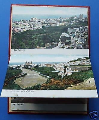 Souvenir of Las Palmas Interessante antico e raro album di vedute della nota località spagnuola, magnifiche vedute a colori sia panoramiche che scorci locali ma anche due costumi popolari, ben 12 vedute formato cartolina, unite insieme e apribili a soffietto (ma facilmente separabili per poter essere spedite per posta) tutte legate con una copertina cartonata rossa artisticamente litografata in oro.    Vedute meritevoli anche di essere incorniciate distintamente Misura cm. 9x13,5 circa (misura di ogni cartolina); J. Perestrello (Photographer); s.d. ma databili fine '800 o primo '900. Di interesse collezionistico decorativo storico-locale artistico e bibliografico Buona conservazione generale, usuali segni o difetti d'uso o d'epoca, sparse fioriture; al verso delle cartoline è presente il tipico prestampato, utile per la spedizione postale.