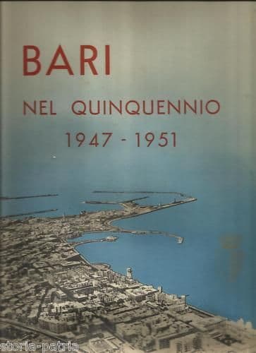 BARI NEL QUINQUENNIO 1947-1951 Bari, Favia, 1952 Cm.33,5; pp.127; cartonato edit. con sovraccopertina figurata (difetti) Interessante edizione d'epoca, bel volume riccamente illustrato, edito per cura di V. ACCOLTI GIL e D. MASELLI, per documentare *"l'opera di ricostruzione ed il fervore di iniziative, che hanno caratterizzato il periodo di rinascita e di adeguamento alle crescenti esigenze della Città seguìto all'angosciosa e rovinosa parentesi bellica";* impossibile ovviamente dare una sintesi dell'ampia trattazione, che ripercorre la storia della città e dei suoi dintorni sin dall'epoca di Giacchino Murat....con dettagliata indagine poi sulle opere inerenti i *LAVORI PUBBLICI* *(Fiera del Levante, strade, scuole, edilizia, illuminazione, giardini, servizi, situazione finanziaria, igiene e sanità, polizia urbana, beneficienza, servizi annonari, trasporti pubblici, centrale del latte)* *I PROBLEMI - LE OPERE* *Acquedotto Pugliese, porto, policlinico, università, edilizia popolare, ferrovie, monumenti)* *BARI VECCHIA* *PIANO REGOLATORE* *con bella pianta topografica a colori ripiegata f.t.* *GLI ISTITUTI - LE CRONACHE* *BARI MONUMENTALE* *SINDACI - RIPRESA NEL DOPOGUERRA - IL GRAN PREMIO AUTOMOBILISTICO DI BARI - FESTE FOLKLORICHE E DANZE CON I TAMBURRELLI AL MAGGIO DI BARI - I CANDELABRI SUL LUNGOMARE* *ATTIVITA' DEL BANCO DI NAPOLI A BARI E IN PUGLIA - LA RADIO A BARI- L'ENERGIA ELETTRICA - CASSA DI RISPARMIO DI PUGLIA - BIRRA PERONI - STANIC - BANCA NAZIONALE DEL LAVORO - DOMOGAS -ISTITUTO CASE AL MEZZOGIORNO - PIRELLI - ALFA ROMEO -ESSO - LA ROCCA- SAGI - CONSORZIO AGRARIO - ALBERGO DELLE NAZIONI -CARROZZERIA ROMANAZZI* *con anche vasto apparato illustrativo, costituito da belle immagini d'epoca a corredo dei vari capitoli trattati, immagini ormai rare che documentano la forte evoluzione storico-urbanistica locale occorsa negli anni.* OPERA DI INTERESSE STORICO-LOCALE, ARTISTICO, FOTOGRAFICO, ECONOMICO, STATISTICO, ARCHITETTONICO, URBANISTICO, INGEGNERISTICO, BIBLIOGRAFICO Buona conservazione generale, segni e difetti d'uso e d'epoca, difetti di adesione ad alcune pagine inevitabili in opere a stampa su carta patinata, strappi e strappetti alla sovraccopertina figurata (raffigurante una veduta aerea della città di Bari con il panorama comprendente anche il porto).