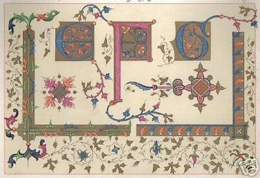 *Documents du Moyen-Âge* *XIV Siècle* Bella e decorativa antica stampa cromolitografica, impressa a più colori, con anche dorature, e raffigurante vari esempi di decorazioni; misura circa cm. 15x22 (l'intero foglio, compresi i margini bianchi diseguali); probabilmente tavola illustrativa di un antico repertorio di stili e decorazioni databile tra fine '800 e primo '900. Di interesse artistico e decorativo Buona conservazione generale, segni e difetti d'uso e d'epoca; **meritevole anche di essere inserita sotto passpartout ed incorniciata.**