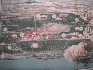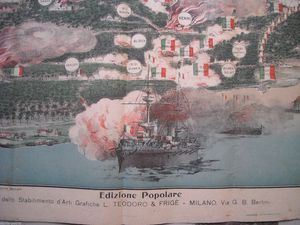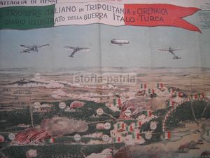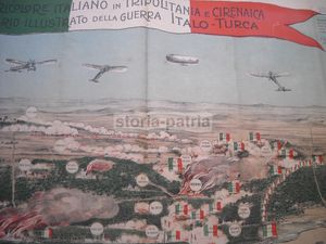 La scenografia illustra navi da guerra italiane nel Mediterraneo, focolai d'incendio e l'impiego precoce di aerei e dirigibili.