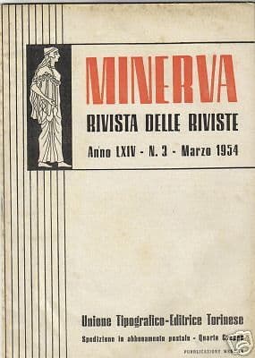 **Minerva** *Rivista delle riviste* Torino, Utet, Marzo 1954 Cm.27,5; pp.da 73 a 1O8; bross. edit. Nota pubblicazione periodica della celebre casa editoriale torinese, interessante dal punto di vista sia letterario che scientifico, oltre che filosofico e storico artistico, e a cui collaborarono importanti nomi del panorama intellettuale sia italiano che estero. Impossibile ovviamente poter dare una adeguata sintesi del contenuto per le innumerevoli citazioni di luoghi e personaggi, ma estrapolando dal sommario troviamo *L'arte primitiva e l'uomo moderno* *Il contributo della carta allo sviluppo della civiltà* *Anna de Noailles e Anatole France* *Poesia magia e mistica* *Pensieri su Rabelais* *.....* *Storia antica degli scioperi* *Lo spirito dell'India* *America puritana* *Sul reato di pornografia: un'opinione* *La vita comica* *.....* *Civiltà e mal di denti* *.....* Di interesse culturale e bibliografico Buona conservazione generale, segni d'uso o d'epoca, fioriture. Creato da [Turbo Lister](https://pages.ebay.it/turbo_lister/)