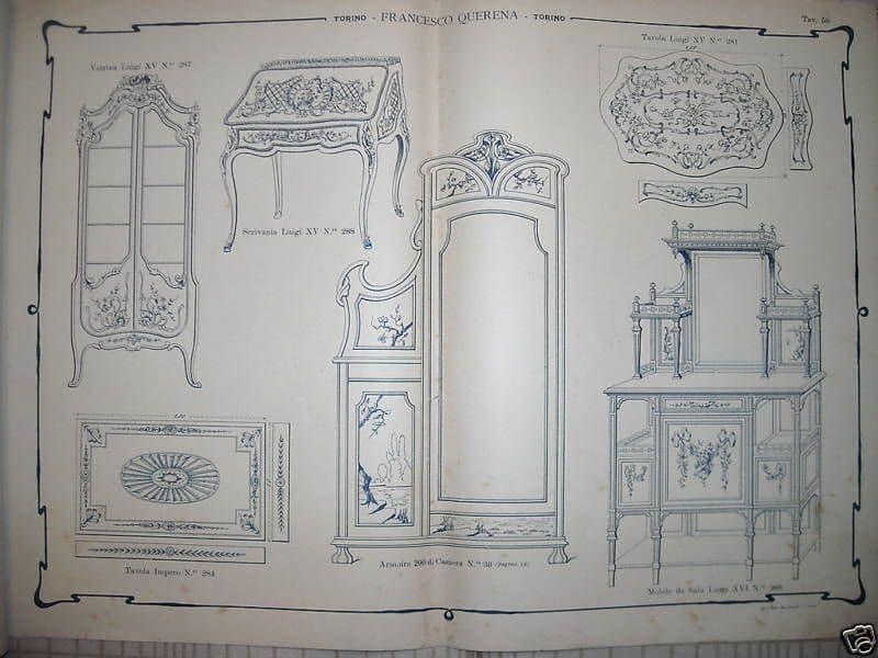 F. Querena Album di mobili in stile moderno Legnami per impiallacciatura ed esotici in tronchi Sculture, intarsi isolati e per camere complete Mandolini chitarre ..... Torino *Filiali o rappresentanze a:* *Milano, Napoli, Livorno, Palermo, Genova, Roma, Bari, Catania, Messina,...* Magnifico antico catalogo illustrato e prezzato della nota fabbrica di ebanisteria torinese, con raffigurati mobili componenti camere di vario stile, armadi comò comodini ... camere da letto in stile Luigi XVI camere Luigi XV camere Impero camera giapponese camere in arte nuova (liberty) vetrina Impero o Giapponese, armoire, tavoli, scrivanie, mobili da sala, ... il tutto in ben otto grandi tavole litografate in blu (lit. Bonis, Torino) numerate da 51 a 58, con una pagina finale che contiene la lista dei mobili e i relativi prezzi. Bella la copertina anteriore, litografata a colori, con anche raffigurate le numerose medaglie simbolizzanti i molteplici premi e onoreficenze ottenuti in varie mostre o esposizioni. Catalogo di cm. 34x50 circa (oblungo); datato Luglio 1905 Di interesse culturale specialistico araldico storico-locale decorativo collezionistico bibliografico Discreta conservazione generale, segni e difetti d'uso e d'epoca, sparse fioriture, sgualciture strappetti e macchie o altri difetti marginali, piegatura centrale, strappi con mancanze alla copertina posteriore, piccole rotture alla piegatura delle carte finali, complessivamente opera di nvalenza artistica e utile alla conoscenza dell'arte e artigianato piemontese del primo '900, e utile a collezionisti restauratori o antiquari al fine di poter identificare più facilmente i mobili della produzione Querena, con le tavole litografiche eventualmente anche meritevoli di essere incorniciate distintamente. *(le immagini allegate raffigurano una delle tavole illustrative e la copertina litografata)*