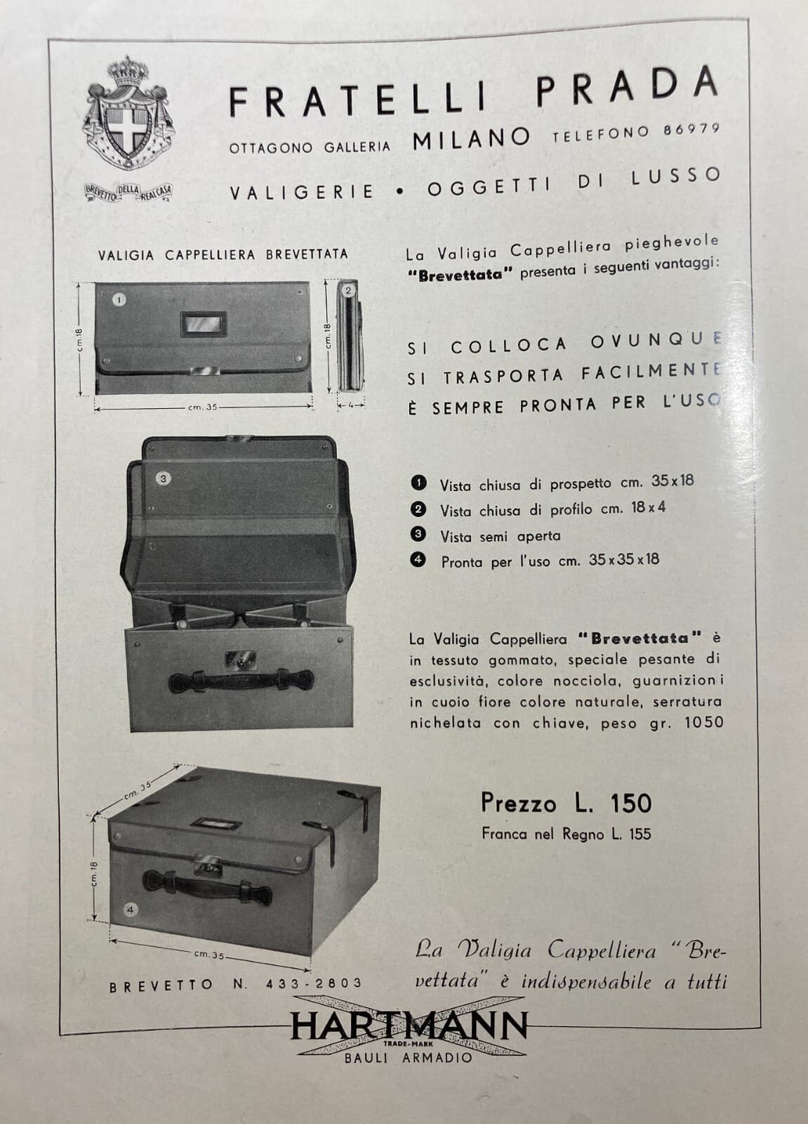 **Fratelli Prada**, *Milano*. Valigerie e oggetti di lusso. Interessante edizione d'epoca costituita da una stampa pubblicitaria dei **Fratelli Prada**. L'inserzione illustra in particolare la valigia cappelliera pieghevole brevettata e il marchio **Hartmann**, celebre produttore di bauli armadio. Il foglio, stampato fronte e retro, presenta sul verso una pubblicità degli orologi da polso **Tavannes**. * **Dimensioni:** cm 38x28 (foglio intero, margini inclusi). * **Tecnica:** Stampa su carta. * **Provenienza:** Inserzione editoriale da rivista d'epoca (1938). Conservazione generale discreta con segni d'uso e del tempo, fioriture sparse, bruniture e lievi sgualciture marginali come da immagini. Foglio idoneo per essere incorniciato.