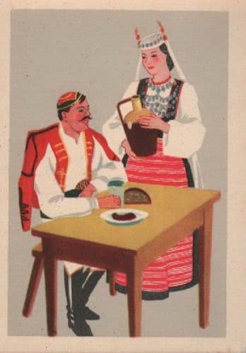 Costumi adriatici **Montenegro** Bella cartolina d'epoca, a colori, raffigurante due costumi tradizionali montenegrini, una popolana che porta da bere al suo uomo seduto a tavola, entrambi con i caratteristici abiti folclorici locali; *misura circa cm. 15x10,5; impressa presso lo stabilimento grafico Giussani (Milano) per conto della "Casa mamma domenica"; databile alla metà del '900.* Di interesse culturale, storico-locale, artistico, folklorico, collezionistico Buona conservazione generale, usuali segni o difetti d'uso o d'epoca, **meritevole anche di essere inserita sotto passpartout ed incorniciata.**