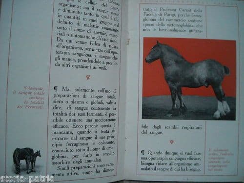 Il medico *dovrebbe essere al corrente della questione degli anticorpi* Interessante edizione originale antica e d'epoca, bella pubblicazione pubblicitaria del farmaco Globeol, prodotto dagli stabilimenti Chatelain di Parigi (con anche succursale in Italia, a Milano), *con esaltazione delle proprietà terapeutiche del Globeol, utile ad arricchire i "fermenti viventi del sangue",* *con anche sperimentata azione antitossica del siero, con utilizzo del siero del cavallo,* *e pertanto molte belle illustrazioni a colori e bn raffigurano cavalli vigorosi, con asserzione che* *"8 pillole di Globeol al giorno danno 500 milioni di globuli rossi al giorno";* *presenti citazioni o riferimenti a Claude Bernard, al prof. Carnot, al cytase di Buchner, a Wright, a Garnier, al bacillo di Eberth, a Lodbelsky, alla sensibilizzatrice di Bordet, ai vibrioni del colera, al prof. Paolo Courmont e a Van der Welde,...* Di interesse medico farmacologico specialistico bibliografico Edito dalla Chatelain, tip. Draeger, s.d. (databile al primo '900, circa 1920 ?); misura circa cm. 19,5x13; pp. 16; bross. edit.; buona conservazione generale, segni e difetti d'uso e d'epoca, sparse fioriture o difetti vari marginali.