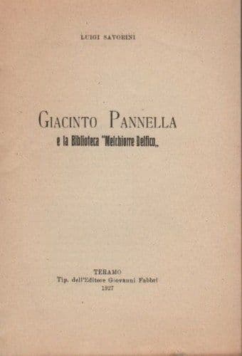 Luigi Savorini Giacinto Pannella *e la Biblioteca "Melchiorre Delfico"* Teramo, Fabbri, 1927 Cm. 18, pp.26, bross. edit. (difetti) Interessante edizione originale antica e d'epoca, con all'interno una dissertazione in merito sia alla figura del noto storico teramano Pannella, sia al suo apporto al miglioramento della biblioteca civica locale, alla quale fece anche dono di molte pubblicazioni, alcune delle quali -i periodici - sono descritte con suddivisione regionale, e tra esse la Rivista Calabrese, Roma Letteraria, Giornale della Liguria, ...e riviste delle Marche, Piemonte, Veneto, Umbria, Sicilia, Toscana, Trentino, Puglie,....di cui non è possibile dare ulteriori informazioni essendo il volumetto ancora a fogli chiusi, ossia mai sfogliato. Di interesse culturale, storico-locale e bibliografico *rara edizione originale,* ***solo sei esemplari noti nel*** *sistema bibliotecario nazionale* Buona conservazione generale, usuali segni o difetti d'uso e d'epoca, difetti e segni di sporco alle copertine, ma complessivamente interno ben conservato, mai sfogliato.