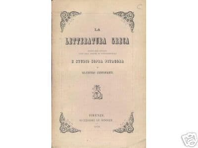 **Centofanti Silvestro** La letteratura greca dalle sue origini fino alla caduta di Costantinopoli e studio sopra Pitagora Firenze, Le Monnier, 1870 Cm.18, pp.425, bross. edit. (difetti, dorso rotto) Interessante edizione antica e d'epoca, volume apparso per cura del noto editore fiorentino Le Monnier, con ampia trattazione storico-letterario-filosofica, in cui si parla delle prime forme poetiche (Omero, Esiodo), delle origini e processo delle tragedie (Eschilo, Sofocle, Euripide), di Socrate, degli storici (Polibio), di Luciano e dei Sofisti. L'ultimo capitolo è dedicato a Pitagora, alla sua scuola e alla sua filosofia. Di interesse culturale letterario specialistico bibliografico Buona conservazione generale, segni e difetti d'uso e d'epoca, difetti alla legatura, esemplare ancora a fogli chiusi.