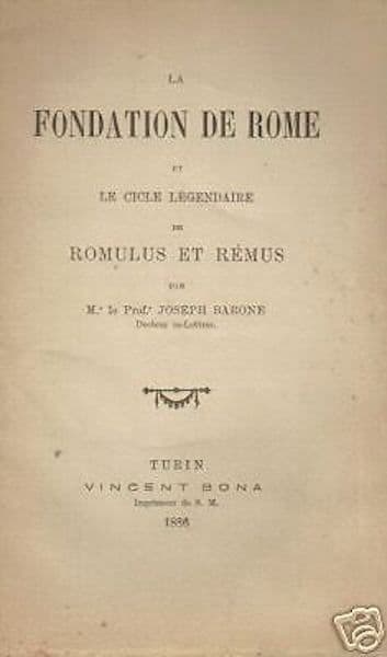 Joseph Barone La fondation de Rome et le cicle legendaire de Romulus ed Remus Turin (Torino), Bona, 1886 Cm.16, pp.40, bross. edit.(sciupata) Interessante edizione antica e d'epoca, rara dissertazione del noto storico e filologo, pubblicazione impressa in lingua francese, impreziosita dalla dedica autografa dell'autore. Di interesse storico culturale e bibliografico Discreta conservazione generale, segni e difetti d'uso e d'epoca, copertine macchiate, eventualmente meritevole di rilegatura.