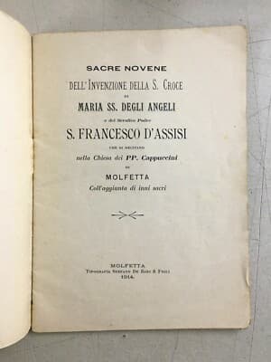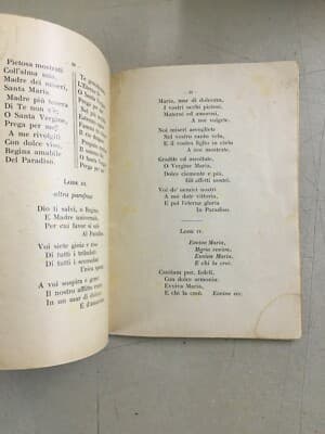 **Giuseppe Tusiani**, *Flora o primi fiori di poesia*, USA (1945). Dimensioni 19,5 cm; pp. 75; brossura editoriale. Rara pubblicazione impressa negli Stati Uniti d'America, probabilmente a *New York*, città dove risiedeva il noto autore e letterato italiano originario del *Gargano* (*San Marco in Lamis*). * **Contenuti**: Include un ritratto fotografico del giovane poeta e una raccolta di componimenti lirici, tra cui Viola, Candelora, Soldato e Rimembranza partenopea. * **Rilevanza Storica**: Al termine del volume compare una nota di congedo datata 15 agosto 1945, testimonianza diretta del sentimento dell'autore verso la conclusione della Seconda Guerra Mondiale in Italia. * **Rarità Bibliografica**: Opera di notevole interesse per il collezionismo di letteratura d'emigrazione; si conoscono attualmente solo cinque esemplari censiti nel sistema bibliotecario nazionale. * **Stato di Conservazione**: Segni d'uso, fioriture e bruniture diffuse, sgualciture marginali; copertine con erosioni superficiali e difetti al dorso.