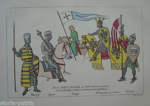 **Chefs Croisés de Nations Diverses** **...** **(XII sec.)** ***Allemand******Genois******Ecuyer******L'Empereur et un Baron*** ***Tancrède*** *Interessante antica raffigurazione di alcuni costumi o modi di vestire di cavalieri Crociati, in epoca medievale (XII secolo) immagini tratti dagli studi del Principe di Hohenlohe-Waldenburg, con specificate le varie tipologie di abiti e armature e chi li indossa, il tutto impreziosito da bella coloritura e con stemmi e vessilli araldici, con croci e animali vari, come pure alcuni antichi armamentari; ** bella stampa cromolitografica, impressa a colori, probabilmente su disegno dello storico e artista francese Jacquemin; edita dalla Libr. Delagrave (Parigi), e impressa da Falcomer; probabilmente in origine tavola illustrativa per una opera specialistica militare araldica della fine dell'800;**misura circa cm.24,5x32,5 (l'intero foglio, compresi i larghi margini bianchi diseguali)* Di interesse storico, militare, araldico, collezionistico, artistico, decorativo Buona conservazione, usuali segni e difetti d'uso e d'epoca, sparse fioriture o difetti vari marginali, meritevole anche di essere inserita sotto passpartout ed incorniciata. *(l'immagine allegata raffigura un particolare dell'intero foglio, eventuali ulteriori informazioni a richiesta)*