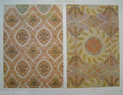 "Stoffe moderne" Interessante stampa antica e d'epoca, bella doppia raffigurazione relativa a decorazioni di tessuti, con motivi vari vegetali e floreali e geometrici, *quella a sinistra disegnata da G. Zuccaro,* *mentre l'immagine a destra è relativa alla stoffa disegnata da G. Guidi;* bella stampa a colori antica e d'epoca, con impresse a colori le immagini dei disegni delle stoffe d'artista; misura circa cm.25x34,5 (l'intero foglio, a margini bianchi diseguali), circa cm.20x27,5 la sola parte figurata (ossia l'insieme delle due illustrazioni); in origine probabilmente stampa apparsa come tavola illustrativa f.t. di una pubblicazione di arte decorativa, edita da Bestetti e Tumminelli (Milano), e databile alla prima metà del '900 (circa anni '20 ?) Di interesse artistico, collezionistico, decorativo Buona conservazione generale, segni e difetti d'uso e d'epoca, sparse fioriture o difetti vari marginali, **meritevole di essere inserita sotto passpartout ed incorniciata.** *(l'immagine allegata raffigura un particolare dell'intero foglio, ossia la sola parte figurata, eventuali ulteriori informazioni a richiesta)*