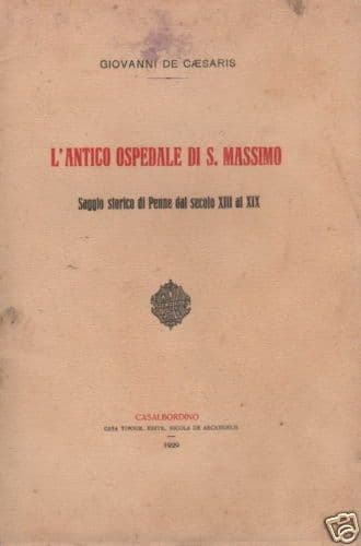 Giovanni de Caesaris L'antico ospedale di S. Massimo Saggio storico di Penne dal secolo XIII al XIX Casalbordino, N. De Arcangelis, 1929 Cm.24, pp.42, bross. edit. (sciupata) Interessante antica e rara edizione originale e d'epoca, ricca pagina di storia locale abruzzese, con innumerevoli citazioni di eventi luoghi e personalità, con citata antica documentazione e con molte ricche note bibliografiche. Edizione antica originale di interesse storico-locale e bibliografico *rara edizione, **solo quattro esemplari noti** nel sistema bibliotecario nazionale.* **Discreta conservazione generale, segni e difetti d'uso e d'epoca, vecchia dedica, segni di vecchio umido in particolare sul lato superiore ma marginale, alcune annotazioni.**