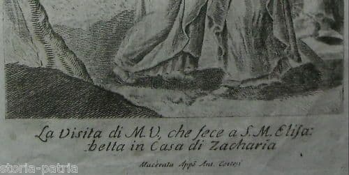 La visita di M. V. che fece a S.M. Elisabetta in casa di Zacharia Interessante antica e rara raffigurazione, inusuale ampia scenografia con paesaggio e prospettive architettoniche di palazzi e case, e varie figure tra cui l'incontro della Madonna con Santa Elisabetta, *il tutto così come concepito probabilmente da un artista antico artista marchigiano, e così come impresso dallo stampatore Cortesi, di Macerata (Marche);* stampa antica e d'epoca, incisione originale all'acquaforte, di belle dimensioni, misura circa cm.31x21 (l'intero foglio, compresi i margini bianchi irregolari e diseguali), circa cm.22x15 l'impronta della lastra di stampa; databile presumibilmente tra fine '700 o prima metà dell'800 (?) [https://img858.imageshack.us/img858/2700/elisabetta3a2.jpg](https://img858.imageshack.us/img858/2700/elisabetta3a2.jpg) [https://img863.imageshack.us/img863/4158/elisabetta3a3.jpg](https://img863.imageshack.us/img863/4158/elisabetta3a3.jpg) [https://img860.imageshack.us/img860/9397/elisabetta3a4.jpg](https://img860.imageshack.us/img860/9397/elisabetta3a4.jpg) [https://img845.imageshack.us/img845/6493/elisabetta3a5.jpg](https://img845.imageshack.us/img845/6493/elisabetta3a5.jpg) Di interesse artistico devozionale storico-locale collezionistico decorativo Discreta conservazione generale, segni e difetti d'uso e d'epoca, sparse fioriture o difetti vari o macchie marginali, piegature e diffuse sgualciture, eventualmente meritevole di (facile) restauro, o almeno **meritevole di essere inserita sotto passpartout ed incorniciata.** *(le immagini allegate raffigurano particolari dell'intero foglio, eventuali ulteriori informazioni a richiesta)* [](https://img858.imageshack.us/i/elisabetta3a2.jpg/) [](https://img863.imageshack.us/i/elisabetta3a3.jpg/) [](https://img860.imageshack.us/i/elisabetta3a4.jpg/) [](https://img845.imageshack.us/i/elisabetta3a5.jpg/)