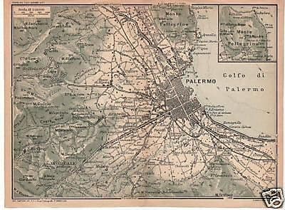 **Palermo** Interessante antica mappa topografica della nota città siciliana, con evidenziata la viabilità cittadina, ma anche il territorio circostante con la conformazione geofisica la viabilità e innumerevoli toponimi, tra cui anche **Monte Pellegrino, Allaura, Vergine Maria, Resuttana, Falde, Altarello, Mezzo Monreale, Monte Grifone, S. Erasmo, Romagnolo, Vetreria Caruso, Monreale, San Martino...** Stampata da Vallardi (Milano), su disposizione del TCI, per una guida turistica e di viaggio del primo '900. **Di interesse storico, artistico, geografico e collezionistico** degna di essere montata sotto passpartout ed incorniciata Dimensione intero foglio cm. 15,5x20,5 circa; buona conservazione generale, segni o difetti d'uso e d'epoca, inevitabile piegatura centrale.
