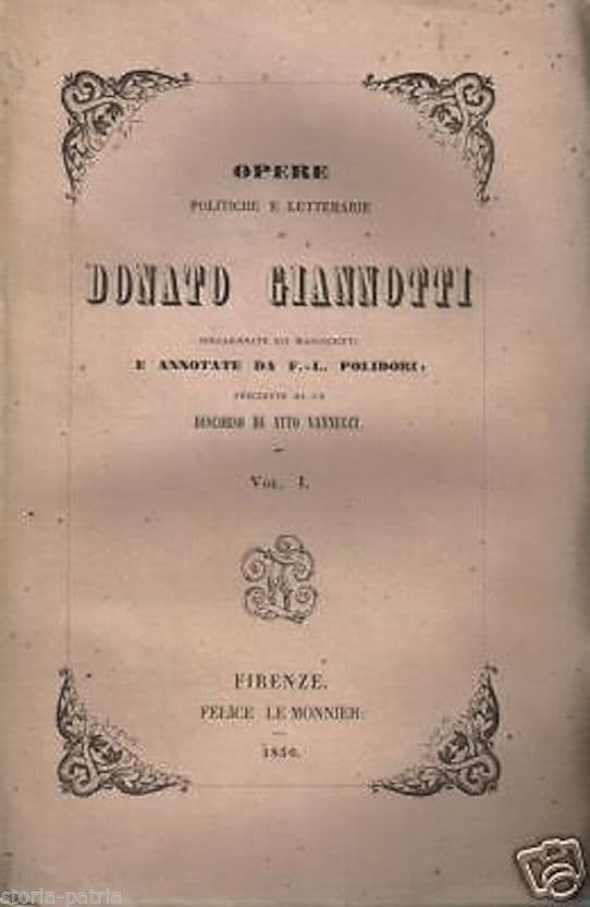 **Donato Giannotti** **Opere politiche e letterarie** **.....** Firenze, Le Monnier, 1850 Cm.18,5; pp.359, bross. edit. Una delle rare e colte opere impresse dal noto editore fiorentino Le Monnier, con una raccolta di scritti del Giannotti, collazionate sui manoscritti a cura di F.L. Polidori e precedute da un "Discorso di Atto Vannucci", che in questo unico primo volume disponibile comprende: *Discorso di Atto Vannucci intorno alla vita e alle opere di Donato Giannotti* *Lettera a Zenobi Bartolini e discorso sopra il fermare il governo di Firenze l'anno 1527* *Discorso intorno alla forma della repubblica di Firenze* *Sulla vita e sulle azioni di Francesco Ferrucci. Lettera a messer Benedetto Varchi* *Trattato della repubblica fiorentina: Dedicatoria al cardinale Niccolò Ridolfi, libri I-IV* *Discorso delle cose d'Italia a papa Paolo Terzo* *Discorso sopra il riordinare la repubblica di Siena* Innumerevoli citazioni di nomi di personaggi eventi località. Di interesse culturale storico e bibliografico Buona conservazione generale, usuali segni o difetti d'uso o d'epoca, usuali diffuse fioriture. Inviate subito le vostre offerte o proposte d'acquisto!!! *(è possibile aggiudicare anche prima della chiusura anticipata dell'asta)* **@@@@@@** **Importante** **Invito a fare offerte solo se veramente interessati all'articolo,** **e per ogni dubbio in merito chiedere ulteriori informazioni e immagini esclusivamente durante l'asta.** **Per facilitare ed accelerare la spedizione, indicare sempre nella causale del pagamento il titolo dell'oggetto acquistato.** **Il pagamento deve essere effettuato entro 3 giorni lavorativi dalla data di chiusura dell'asta (dilazioni di tempo devono essere concordati, salvo per più acquisti a scadenza diversa), in caso contrario chiederò ad Ebay il rimborso delle commissioni e vi segnalerò come** *offerente non pagante* **lasciandovi un feedback negativo.** **Normalmente e salvo imprevisti spedisco entro il giorno successivo alla ricezione del pagamento.** **Effettuo solo spedizioni certificate da ricevuta (posta raccomandata, pacco normale o celere, corriere) e pertanto evitate di chiedermi spedizioni in posta prioritaria o ordinaria (metodi non sicuri).** **Ogni spedizione viaggia a totale rischio dell'acquirente, che però può cautelarsi indicando un metodo di spedizione o un corriere di sua scelta e gradimento.** *Vendita tra privati e senza alcuna forma di garanzia o di restituzione; l'articolo in asta è come descritto nella scheda e come presentato nelle fotografie allegate, visto e piaciuto, e pertanto chi intenda fare offerte o proposte di acquisto può chiedere ulteriori informazioni esplicative esclusivamente prima dell'acquisto; l'acquirente accetta, senza riserve, l'esclusione di qualsiasi forma di garanzia o restituzione, salvo accordi diversi da definirsi prima della chiusura dell'asta. Grazie per l'attenzione!* *\======* *I invite to watch the others my auctions* Creato da [Turbo Lister](https://pages.ebay.it/turbo_lister/)