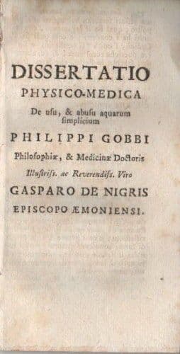 Filippo Gobbi Dissertatio physico-medica de usu, & abusu acquarum semplicium .... Gasparo De Nigris *Episcopo Aemoniensi* S.i.t. , s.d.(Venezia ?, circa metà '700 ?) Cm.14,5; pp.(da pag. 175 a pag.208); senza legatura. Interessante edizione antica e d'epoca, *rarissimo dotto saggio scientifico specialistico del Gobbi (medico triestino ?) dedicato al De Nigris,* *con dissertazione di carattere medico terapeutico, di ardua sintesi anche per la redazione in latino,* *ma in cui si parla di antiche pratiche terapeutiche con utilizzo di acque semplici, e riflessi su muscolatura, apparato nervoso, febbri, ....e applicazioni di acqua fredda o gelida, convulsioni, ...con riferimenti anche ad Ippocrate e Malpighi,...* *il tutto oggi pertinenza della storia della medicina.* Di interesse specialistico, storico-medico, collezionistico, bibliografico *rarità d'epoca, **nessun esemplare noto** nel sistema bibliotecario nazionale.* Buona conservazione generale, segni e difetti d'uso e d'epoca, diffuse fioriture, opera slegata e parzialmente a fogli sciolti, senza legatura o copertine (edizione apparsa in una raccolta miscellanea di scritti vari settecenteschi) e pertanto meritevole di rilegatura.