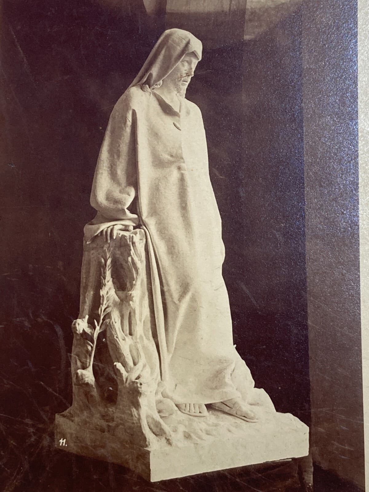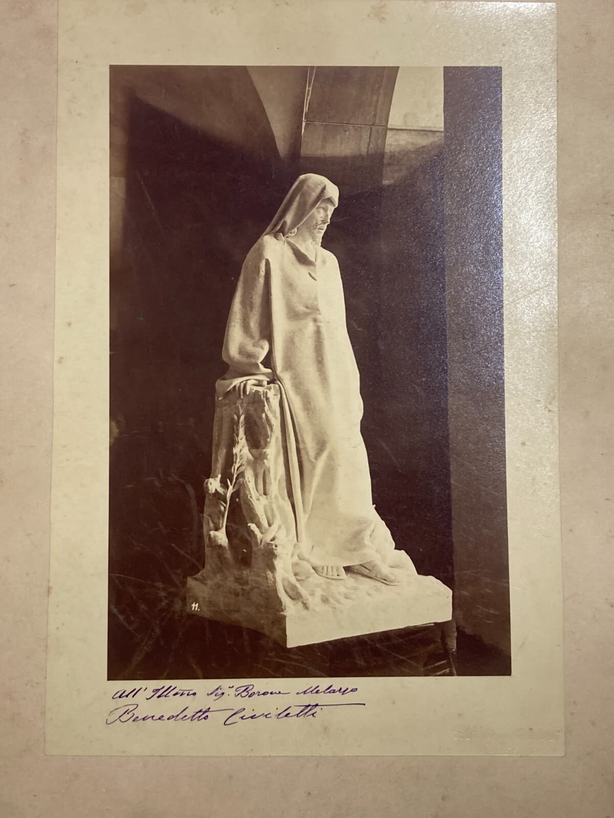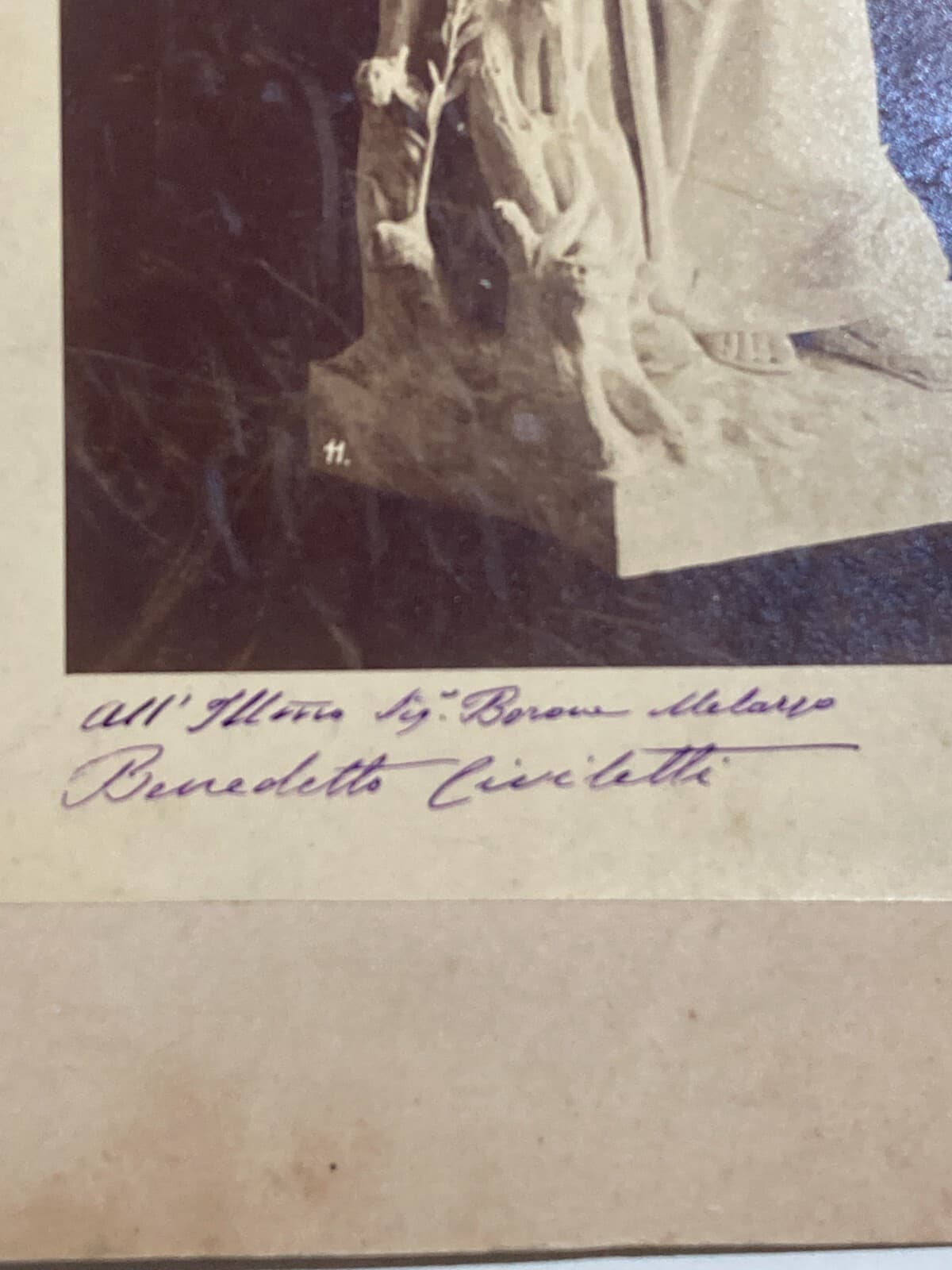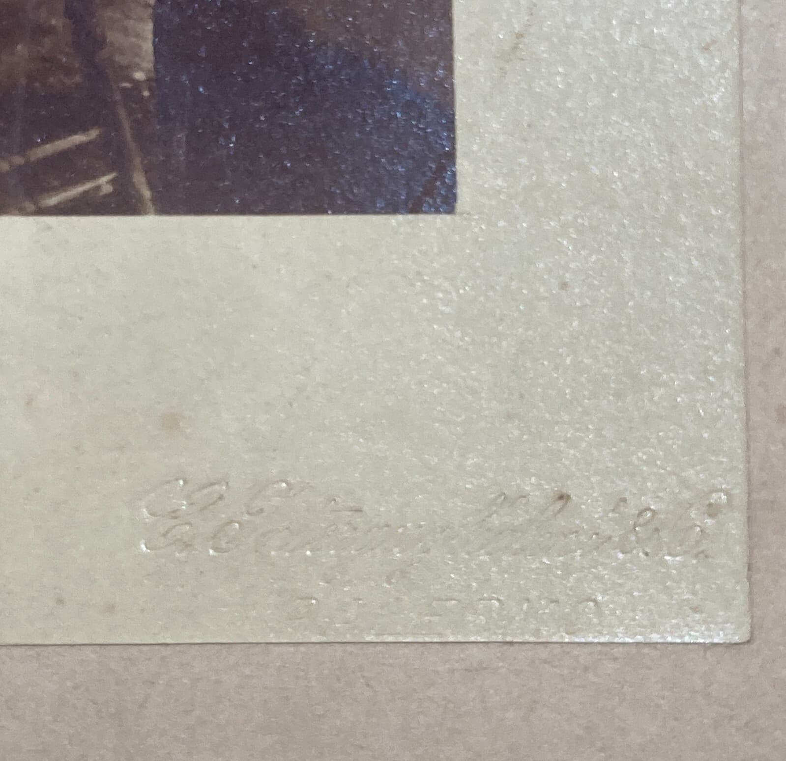 Antica fotografia originale raffigurante una coppia, probabilmente di coniugi bergamaschi. Il ritratto circolare (diametro 9 cm) è montato su un cartoncino di supporto originale recante l'indirizzo dello studio: **Viale Stazione 10, Bergamo**. * **Dimensioni fotografia**: 10,5x14,5 cm circa. * **Supporto**: Cartoncino 17x24 cm con stemma araldico (corona) impresso a secco. * **Epoca**: Inizio del XX secolo (circa 1900-1919). * **Condizioni**: Stato di conservazione modesto; presenti fioriture, bruniture sparse e segni d'uso marginali che non compromettono la qualità dell'immagine fotografica.