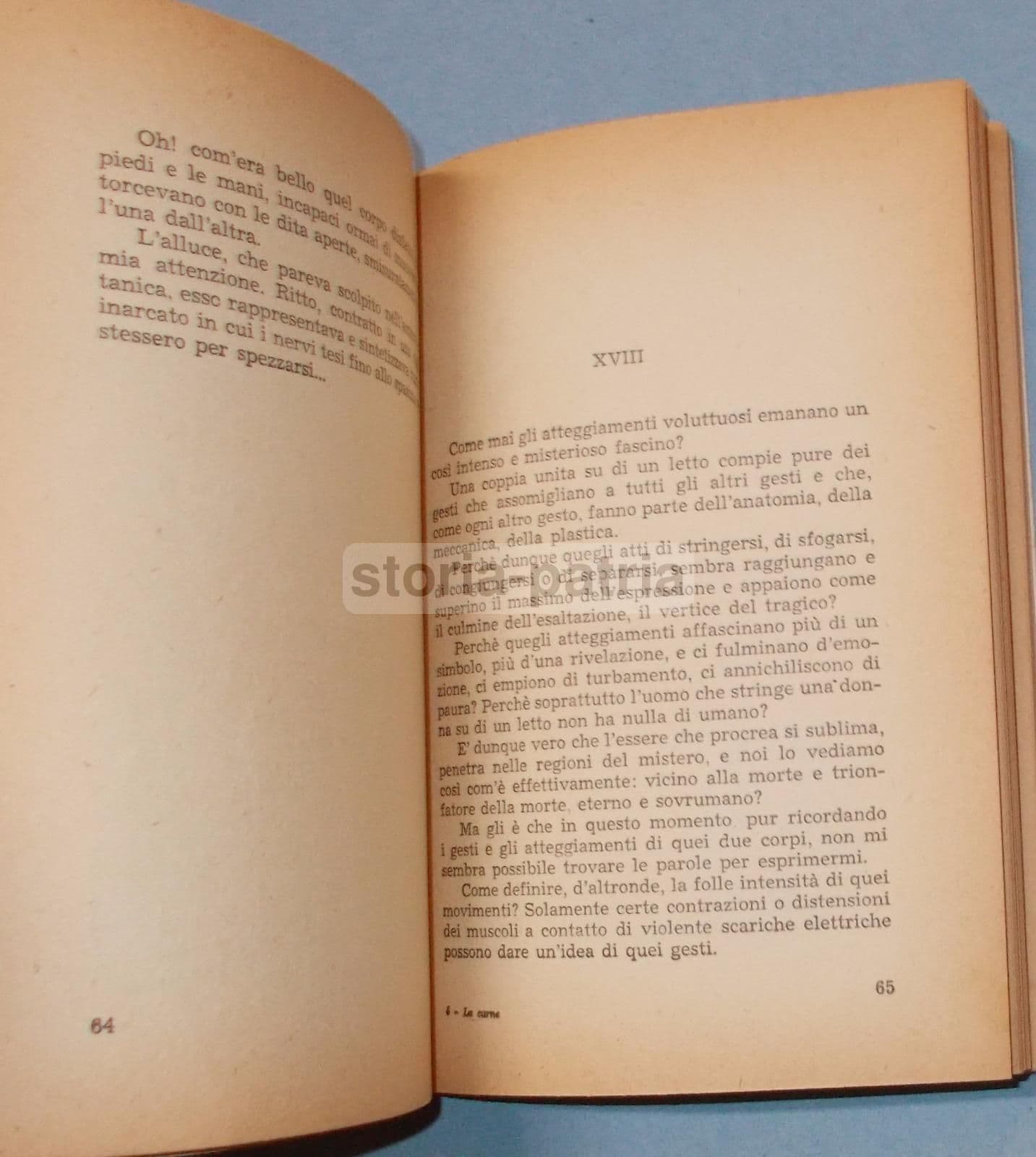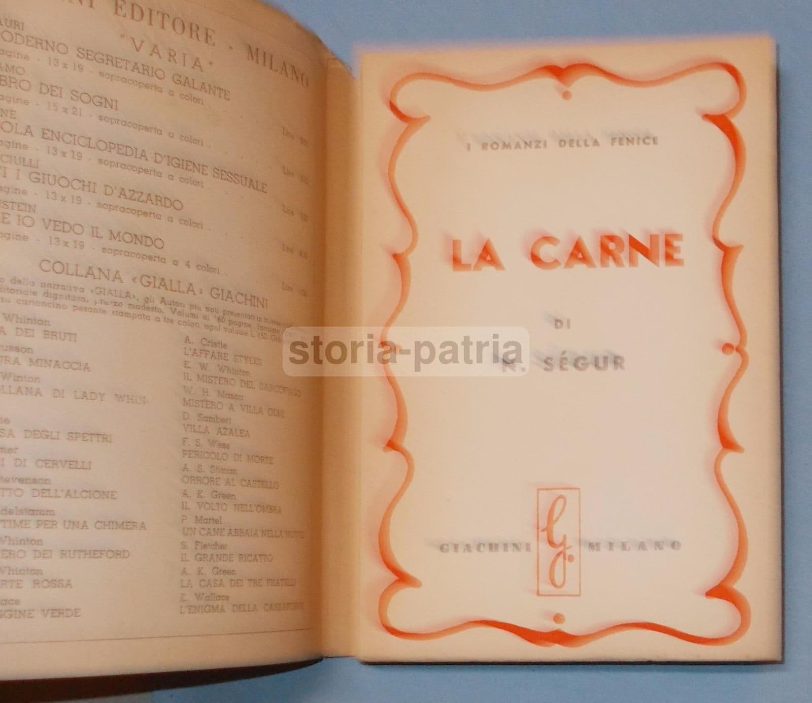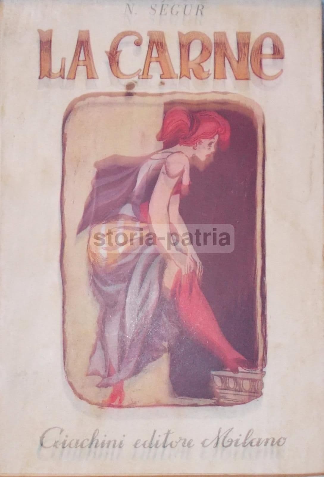 N. SEGUR LA CARNE Milano, Giachini, 1952 Cm.18, pp.158, bross. edit. (difetti alla sovraccopertina figurata) Interessante edizione, volume apparso nella collana dei Romanzi della Fenice, con trattazione narrativa a sfondo sensuale o anche erotico, *con all'interno riferimenti psicoanalitici e a Freud, al sesso e all'amore, alla carne e al delirio sensuale, ...con anche riferimenti a città italiane toccate dal narratore in un viaggio che lo porterà verso la Grecia e a Corfu',* *con citate Venezia, il Sempione, Stresa, Isola Bella, Lago Maggiore, il Danieli a Venezia, Genova, il piroscafo Aquila, Piazza S. Marco, Santa Maria Formosa, Ponte della Paglia, il Lido, Ancona, Bari, ...la ricotta di Montecavallo, il Passito di Sicilia,...;* con bella illustrazione a colori impressa sulla sovraccopertina anteriore. DI INTERESSE CULTURALE, LETTERARIO, STORICO LOCALE, BIBLIOGRAFICO Discreta conservazione generale, segni e difetti d'uso e d'epoca, sparse fioriture e bruniture e difetti vari marginali o così come visibili nelle immagini allegate; difetti vari alla sovraccopertina, con fioriture e gore, e spellature alla copertina posteriore, ma interno molto ben conservato e probabilmente libro poco o mai sfogliato. *(le immagini allegate raffigurano alcuni particolari dell'intera pubblicazione, eventuali ulteriori informazioni a richiesta)*