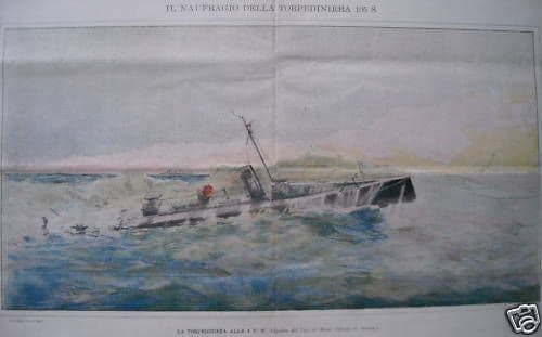 Il naufragio della Torpediniera 105 S Interessante ampia veduta di una disastrosa scena avvenuta in mare, probabilmente al largo del golfo di Napoli, alla fine dell'800, relativa al naufragio della Torpediniera 105 S, in particolare l'immagine ritrae la nave alle ore 4 p.m.; *stampa originale litografica a colori, tratta da un dipinto eseguito (forse dal vero) dall'Ufficiale di Marina Cav. De Maria; litografata a cura del napoletano G. Borgo-Caratti; apparsa originariamente come illustrazione a doppia pagina di una pubblicazione periodica della fine dell'800 (da L'Italia Marinara, 1892)* Belle grandi dimensioni, misura cm.39x58 circa (l'intero doppio foglio aperto, compresi i margini bianchi diseguali) Opera di interesse storico, storico-locale, militare, collezionistico, decorativo Buona conservazione generale, segni e difetti d'uso e d'epoca, piegature e sgualciture, inevitabile piegatura centrale, foglio con scritte impresse al verso, **stampa meritevole di essere inserita sotto passpartout ed incorniciata.** (l'immagine allegata raffigura un particolare dell'intero foglio) *(conservato l'intero fascicolo originale, che si invia con la stampa, pubblicazione in cui sono anche presenti alcune interessanti inserzioni pubblicitarie, una con veduta antica del porto di Genova, oltre a notizie di interesse specifico marinaro militare; con anche bella intestazione figurata xilografica e allegorica, con l'Italia simboleggiata da una donna seduta ed appoggiata ad uno scudo sabaudo, opera dell'artista S. De Stefano).*