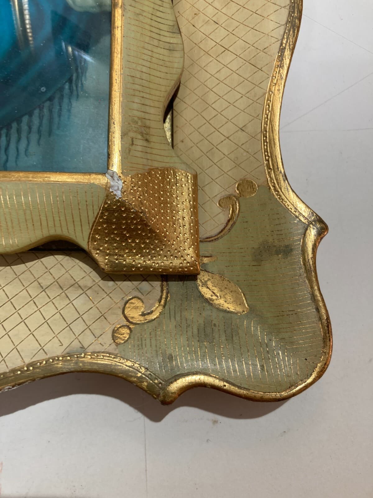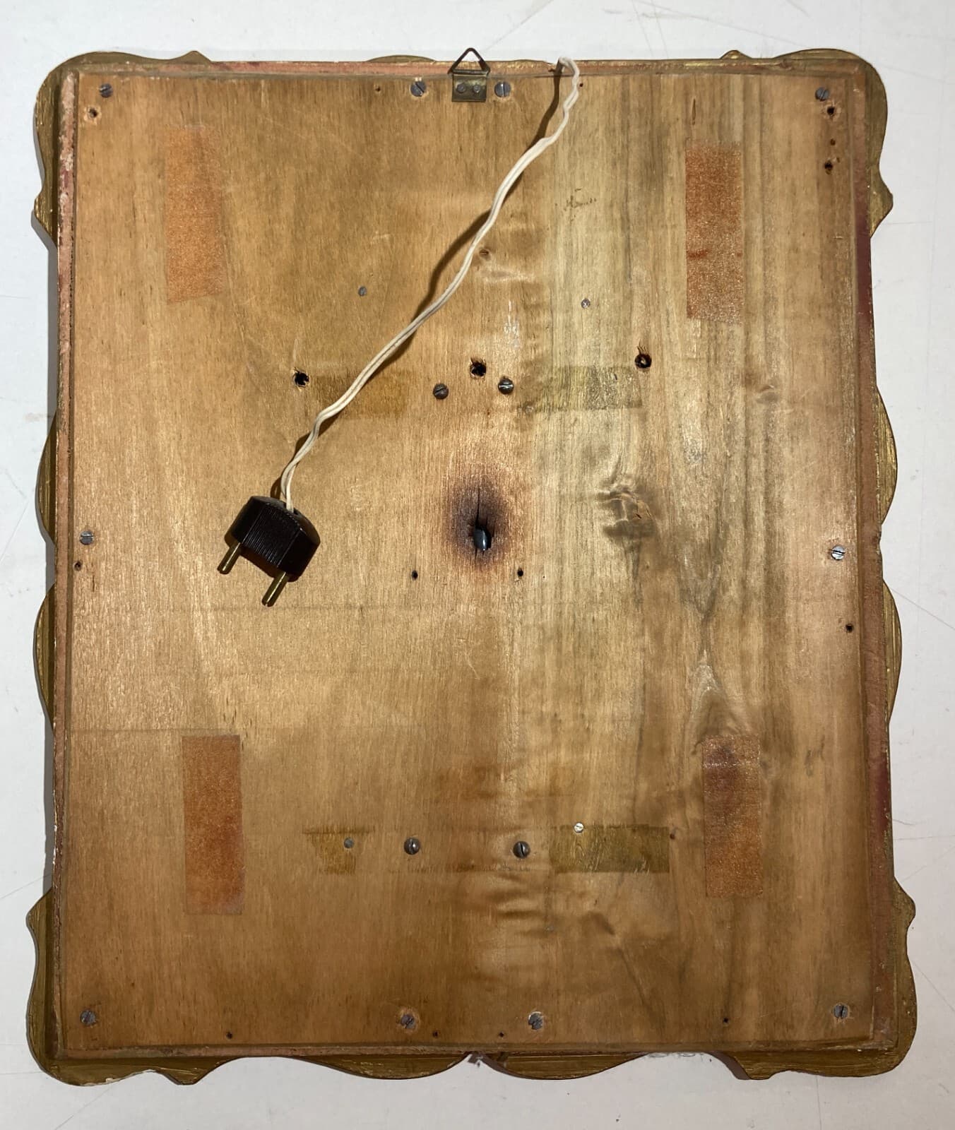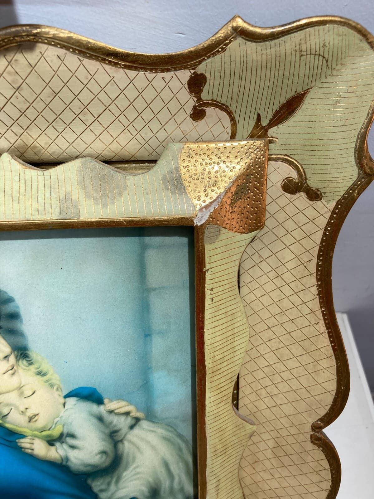 Interessante quadro decorativo raffigurante la celebre **Maternità** di **Roberto Ferruzzi**, nota anche come *Madonnina* o *Madonna delle Vie*. Il quadro è caratterizzato da una doppia cornice lignea con decorazioni in gessatura e laminatura dorata. L'immagine è una stampa applicata su vetro inserita nella cornice interna. L'oggetto è stato originariamente concepito come quadro luminoso: il retro è chiuso da un pannello ligneo che nasconde un vano per lampadina destinato a retroilluminare l'opera. * **Soggetto**: Riproduzione della celebre opera premiata alla Biennale di Venezia nel 1897, ispirata alla giovane veneziana Angelina Cian. * **Dimensioni**: Cornice esterna 38x32 cm; cornice interna 29x23 cm; parte figurata 23x16,5 cm. * **Epoca**: Metà del XX secolo (circa 1930-1950). * **Condizioni**: Stato di conservazione modesto. Sono presenti segni del tempo, abrasioni e piccole sbeccature sulla cornice. L'impianto elettrico originale è presente ma non testato, necessita di revisione professionale e pulizia generale.