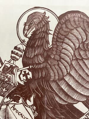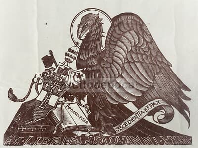Incisione xilografica originale di **Bruno Marsili**, noto come **Bruno da Osimo**. L'opera raffigura un'allegoria dell'Apocalisse di San Giovanni, concepita probabilmente come *ex-libris* (*Apocalypsis Oboedientia et Pax*). **Autore**: **Bruno da Osimo** (**Bruno Marsili**). **Soggetto**: Allegoria biblica con aquila e simboli ecclesiastici. **Tecnica**: Xilografia su carta, firmata a matita. **Dimensioni**: foglio cm 23,5 x 32,5 circa. **Epoca**: metà del XX secolo (circa 1940-1950). **Stato di conservazione**: segni d'uso, fioriture sparse, bruniture e pieghe marginali. Cornice lignea d'epoca inclusa.