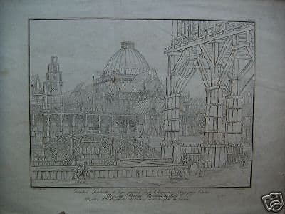 Bella antica raffigurazione delle grandiose fabbriche di legno praticate dagli oltramontani Schizzo presso l'Autore. Al Sig. Giuseppe Misirini di Forlì Membro dell'Imperiale Accademia di belle Arti in Firenze. Eccezionale incisione originale all'acquaforte, disegnata dal famoso artista bolognese Antonio Basoli Castelguelfo-Bologna, 1774-1848 ed incisa dal Romagnoli probabilmente per una raccolta di scenografie. Misura cm.30,5x38,5 (lastra), su foglio cm.37,5x50; Ampia la bibliografia sull'artista bolognese, di grande rarità le sue mirabili e fantastiche opere Opera di grande interesse collezionistico Modesta conservazione generale, difetti d'uso e d'epoca,difetti e strappetti marginali, piccola mancanza al margine inf., strappo in basso nell'immagine, tracce d'uso diffuse; esemplare degno di restauro, ed eventualmente da montare sotto passpartout ed incorniciare. $$$$$$$$$$$$ Guarda le altre mie aste! \>>Tutte le mie offerte sono garantite originali e d'epoca<<
