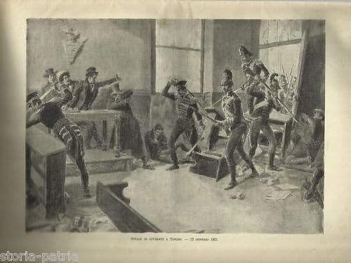 *Strage di studenti a Torino* *(12 gennaio 1821)* Interessante antica veduta, raffigurante un noto episodio legato agli avvenimenti risorgimentali italiani e alla epopea garibaldina, con visibili soldati che all'interno di una scuola di Torino trafiggono studenti con le loro baionette; stampa antica, di belle dimensioni, misura circa cm.30x22 (l'intero foglio, compresi i margini bianchi diseguali); foglio originariamente edito quale tavola illustrativa fuori testo (verso bianco) di una pubblicazione storico risorgimentale del primo '900. Di interesse storico, risorgimentale, storico-locale, militare, collezionistico Buona conservazione generale, segni e difetti d'uso e d'epoca, sparse fioriture, difetti vari marginali, **meritevole di essere inserita sotto passpartout ed incorniciata.** *(l'immagine allegata raffigura un particolare dell'intero foglio, eventuali ulteriori infromazioni a richiesta)*