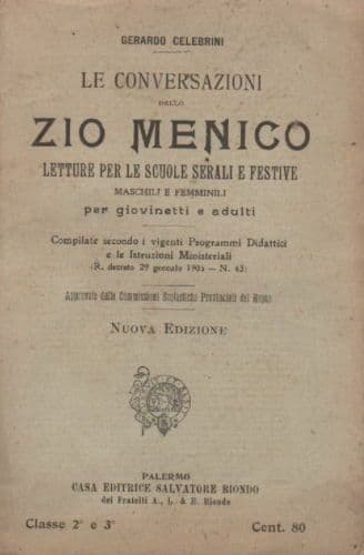 GERARDO CELEBRINI LE CONVERSAZIONI *DELLO* *ZIO MENICO* *....* Palermo, Biondo, 1913 Cm.19, pp. 160, bross. edit. (difetti) Interessante edizione siciliana antica e d'epoca, bel volume istruttivo per "giovinetti e adulti", nato quale libro da servire per le "scuole serali e festive maschili e femminili", volume per le classi 2a e 3a, con all'interno una ampia trattazione che spazia nei vari campi della cultura, dalla medicina alla storia naturale, alle scienze e invenzioni, alla geografia e a numerose altre notizie pratiche, il tutto attraverso una serie di conversazioni, di cui purtroppo non è possibile dare una esauriente sintesi per essere il volume ancora a fogli chiusi (ossia mai sfogliato), e solo estrapolando dagli indici segnaliamo capitoli o argomenti su: *DISINFESTAZIONE DELLA STALLA* *COME SI MUNGE IL LATTE* *ULIVI DANNEGGIATI DAL FREDDO* *CURA DEGLI AGRUMI* *RISPETTO AI MILITARI* *PIETRO MICCA* *LA CARBONERIA* *TURPILOQUIO* *ECONOMIA* *SCIOPERO E LAVORO* *CASSA NAZIONALE* *RISPETTO ALLE DONNE* *SILVIO PELLICO* *ANIMALI UTILI* *USO E ABUSO DEL VINO E DEI LIQUORI* *DIETA* *TABACCO* *IGIENE DEL CORPO* *VISTA, UDITO, ODORATO, GUSTO, TATTO* *ASFISSIA* *SOCCORSO AGLI ANNEGATI* *FAMIGLIA E MATRIMONIO* *BACHI DA SETA* *AMERICA E EMIGRAZIONE* *MONETE FALSE* *AVVELENAMENTI* *MILITARIA* *SOCCORSO AI FERITI* *SEMINA E AGRICOLTURA* *POLITICA E GOVERNI* *GRANDI INVENZIONI* *IMPIANTI IDROELETTRICI* *ALFIERI* *TASSE* *NICCOLO' TARTAGLIA* *COLOMBO* *GIUSTIZIA E GIUDICI* *FRUTTICOLTURA* *COMUNE E AMMINISTRAZIONI* *CONTRO L'USO DI VIVERE NELLE STALLE* *.....* *con alcune immagini illustrative, illustrazioni da disegni di Luca Fornari, veduta dell'Ossario presso Novara, la Breccia di Porta Pia da un dipinto dell'Ademollo,...* DI INTERESSE STORICO-LOCALE, PEDAGOGICO, CULTURALE, FOLKLORICO, BIBLIOGRAFICO Buona conservazione generale, segni e difetti d'uso e d'epoca, sparse fioriture, difetti e strappetti o rotture alle copertine o al dorso, ma esemplare complessivamente ben conservato, mai sfogliato e pertanto ancora a fogli chiusi.