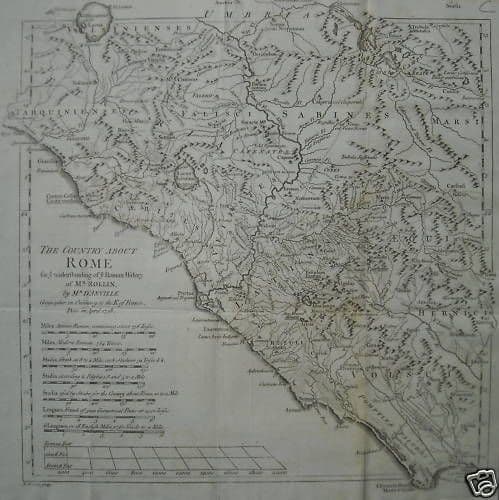 THE COUNTRY ABOUT ROME .... Interessante antica e rara cartografia comprendente buona parte del Lazio, e le provincie confinanti dell'Umbria e dell'Abruzzo (Marsica)...e scendendo verso il basso fino a Terracina- Anxur, con ben visibili le Paludi Pontine, il Lago di Bracciano, e innumerevoli altri toponimi, relativi a piccole o grandi località, con i loro nomi espressi in latino, ossia dell'epoca romana in cui è collocata questa cartografia, e sommariamente segnaliamo quelli di *TUSCANIA, VITERBO, NARNI, RIETI, TARQUINIA, CIVITAVECCHIA, SUTRI, VEIO, CAPENA, FERENTINO, OSTIA, ARDEA, SESSA, POMEZIA, NETTUNO, ANZIO, MONTE CIRCELLO, ALBANO, ARICCIA, FRASCATI, PALESTRINA, ANAGNI, TIVOLI, CARSOLI, ALBALONGA, FIUME TEVERE,...con anche la conformazione geofisica dei territori, il sistema fluviale o stradale, le coste,....* Incisione originale all'acquaforte, datata 1738, eseguita dal noto cartografo francese D'ANVILLE, in origine tavola illustrativa di un'opera di storia romana. **BELLA CARTA VERGELLATA E GRANDE FILIGRANA A SOGGETTO ARALDICO** DI INTERESSE CULTURALE GEOGRAFICO, STORICO-LOCALE, BIBLIOGRAFICO DECORATIVA E DA COLLEZIONE Misura cm. 33 x 33 ca. (l'intero foglio compresi i margini bianchi diseguali); buona conservazione generale, segni e difetti d'uso e d'epoca, inevitabili piegature; **meritevole di essere inserita sotto passpartout ed incorniciata.**