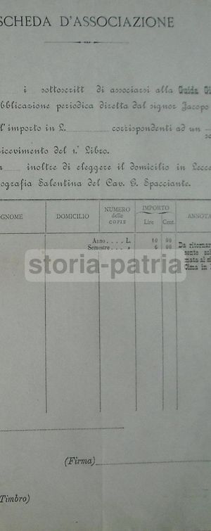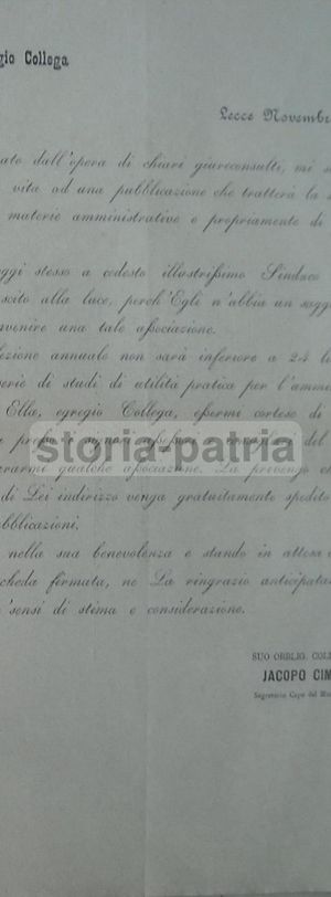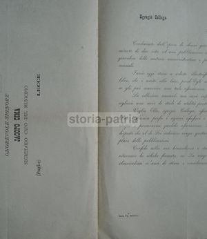 Interessante edizione antica e d'epoca, depliant-pieghevole pubblicitario della Guida Giuridica dei Comuni che all'epoca il segretario comunale leccese Cima aveva intrapreso ad editare. La presente stampa era inviata dall'autore ai possibili interessati per ottenere l'abbonamento alla serie di guide annuali. * Stampatore: Tipografia Salentina (Lecce). * Data: 1885. * Formato: Circa 28x20,5 cm (chiuso). Il documento, impresso al recto e al verso e ripiegato, presenta segni del tempo quali fioriture, bruniture e piccole lacerazioni marginali, ma conserva intatto il suo valore storico-bibliografico e collezionistico.