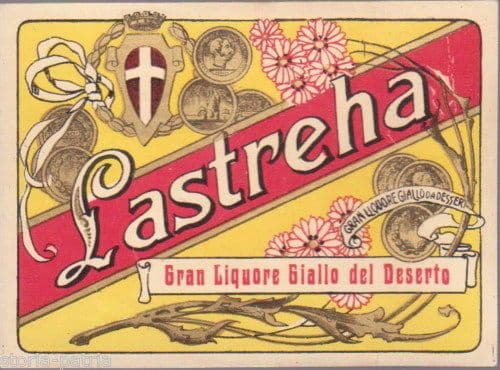 Lastreha *Gran Liquore Giallo del Deserto* *Gran Liquore Giallo da Dessert* Bellissima antica etichetta, inusuale e rara, pubblicitaria di un liquore che potrebbe identificarsi nel notissimo liquore beneventano Strega, del quale la etichetta è pure molto simile, come simile è il colore del liquore (giallo) e con curiosa interpretazione del "dessert" come "deserto", probabilmente etichetta che in antico ha voluto imitare quella celebre del vero Strega; *esemplare molto bello graficamente, con ricche allegorie araldiche, medaglie e scudo sabaudo, e fiori, il tutto nel gusto dell'epoca liberty;* etichetta che in origine era probabilmente incollata su bottiglia di liquore, ma esemplare evidentemente mai utilizzato; misura circa cm. 9x12 (l'intero foglio, compresi i minimi margini bianchi);presumibilmente databile al primo '900 (?) Di interesse specialistico, pubblicitario, araldico, collezionistico Buona conservazione generale, segni e difetti d'uso e d'epoca, difetti vari sgualciture e strappetto marginali, **meritevole anche di essere inserita sotto passpartout ed incorniciata.**