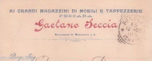 Ai Grandi Magazzini di Mobili e Tappezzerie Pescara **Gaetano Seccia** Successore V. Mascaretti & C. Interessante antica e rara cartolina, pubblicitaria dei magazzini di mobili e tappezzerie del Seccia, che rilevò la gestione che era già della società Mascaretti; cartolina originale antica e d'epoca, con intestazione pubblicitaria, misura circa cm.9x14; viaggiata per posta e ancora con affrancatura postale originale (timbri e francobollo al recto); con corrispondenza o nota spese autografa del titolare Gaetano Seccia; datata 1898; *(spesso però la data di spedizione può non indicare l'effettiva data di edizione della cartolina, che potrebbe essere antecedente anche di alcuni anni e spedita solo successivamente)* Di interesse storico-locale, commerciale, specialistico, artistico, collezionistico Discreta conservazione generale, segni e difetti d'uso e d'epoca, sgualciture e difetti vari marginali, **meritevole anche di essere inserita sotto passpartout ed incorniciata** *(l'immagine allegata raffigura un particolare dell'intero oggetto, ossia parte del recto della cartolina, con evidenziata la intestazione; eventuali altre informazioni a richiesta)*