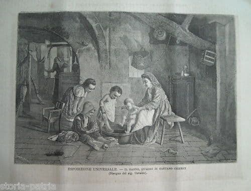 *Il bagno* *Quadro di Gaetano Chierici* *....* Interessante antica veduta del modesto interno di una abitazione, con una mamma intenta a far fare il bagno al più piccolo dei suoi figli, con gli altri bambini intenti a curiosare, uno di loro anche seduto con un gatto in braccio; *illustrazione disegnata dall'artista Osvaldo, ispirata da un dipinto del noto pittore italiano Gaetano Chierici,* *immagine edita per un periodico illustrato dell'epoca, documentazione della partecipazione artistica italiana alla Esposizione Universale di Vienna del 1873;* incisione xilografica antica e d'epoca, misura circa cm.23x32,5 (l'intero foglio, compresi i margini bianchi diseguali), circa cm.15x22 la sola parte figurata; stampa edita in origine quale illustrazione di una pubblicazione periodica italiana della seconda metà dell'800 (1873); foglio originale, estratto dal periodico dell'epoca. Di interesse artistico, folklorico, decorativo, collezionistico Buona conservazione generale, segni o difetti d'uso e d'epoca, diffusa brunitura della carta, sparse fioriture e difetti vari marginali, foglio originale estratto dal periodico dell'800, illustrazione nel testo e pertanto con scritte di testo impresse sia al recto che al verso del foglio, **stampa meritevole di essere inserita sotto passpartout ed incorniciata.** *(le immagini allegate raffigurano un particolare dell'intero foglio, ossia la sola parte figurata, eventuali ulteriori informazioni a richiesta)*