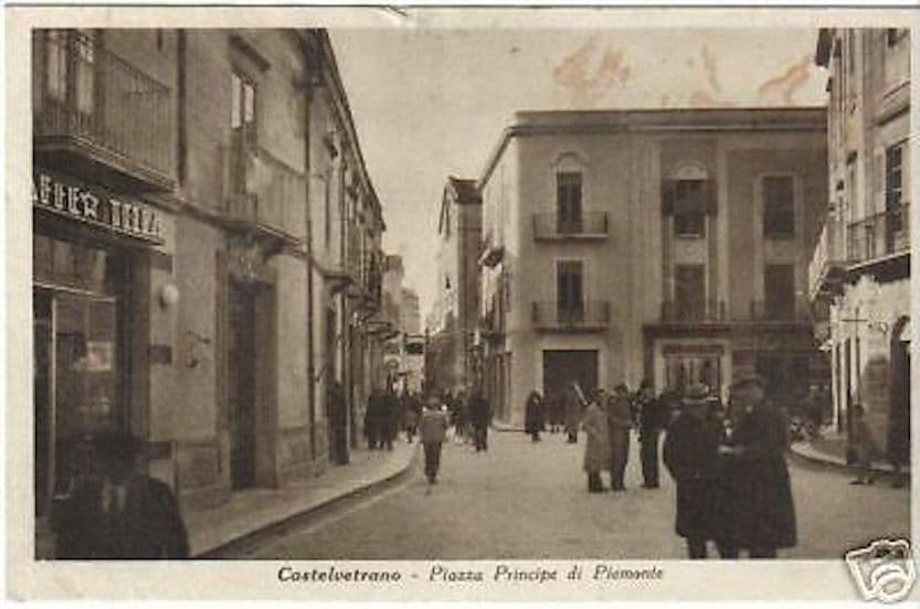 Castelvetrano *Piazza Principe di Piemonte* *Interessante veduta di un animato scorcio cittadino della nota cittadina siciliana, con visibili numerose persone e insegne di negozi.* Cartolina originale d'epoca, piccolo formato, misura circa cm. 9x14, non viaggiata; databile anni '30; Ediz. Ciravolo (Castelvetrano) Di interesse storico-locale fotografico e collezionistico Modesta conservazione generale, segni e difetti d'uso e d'epoca, difetti e macchie di vecchio umido, in parte scollata, **meritevole anche di essere inserita sotto passpartout ed incorniciata.**