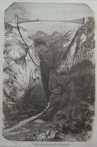 *"Il Ponte Carlo Alberto in Savoja"* Interessante stampa antica e d'epoca, bella veduta panoramica dei monti della Savoia, con una vasta gola sul fondo della quale scorre un fiume o ruscello, e tra le sommità delle due rocce, in alto, è ben visibile il lungo ponte teso e percorso da viandanti o mezzi, bella opera di architettura e ingegneria; incisione originale xilografica, misura circa cm. 29x21 (l'intero foglio, a margini bianchi diseguali), circa cm.22x14,5 la sola parte figurata; stampa che in origine venne impressa quale corredo illustrativo di una pubblicazione periodica della metà dell'800 (Emporio Pittoresco); pertanto illustrazione nel testo, su foglio con scritte impresse sia al recto che al verso, foglio originale estratto dalla rivista dell'epoca; databile alla metà dell'800 (**1865)** Di interesse artistico, storico-locale, ingegneristico, collezionistico, decorativo Buona conservazione generale, segni e difetti d'uso e d'epoca, sparse fioriture e difetti vari marginali, **meritevole di essere inserita sotto passpartout ed incorniciata.** *(l'immagine allegata raffigura un particolare dell'intero foglio, ossia la sola parte figurata, eventuali ulteriori informazioni a richiesta)*