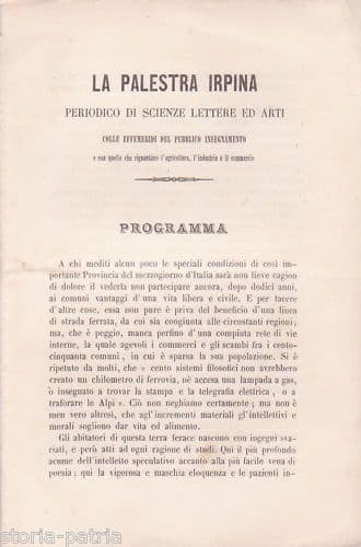 La Palestra Irpina *Periodico di scienze lettere ed arti* *Colle effemeridi del pubblico insegnamento e con quelle che riguardano l'agricoltura, l'industria e il commercio* Avellino, genn. 1872 Cm. 22x14; pp. 8; senza legatura. Interessante antico e raro foglio volante, pubblicitario della neo rivista irpina "La Palestra Irpina", con il Programma e gli intenti della redazione, in cui vengono anche citati personalità illustri del meridione, da De Meo a De Luca, Mancini, Imbriani, De Sanctis, Parzanese; *palestra irpina poiché il periodico sarà aperto ad ogni apporto culturale e non espressione di una casta, nel rispetto dei principi di "sapienza, amore e virtute";* il programma è sottoscritto (a stampa) dal direttore della rivista, Luciano Loparco, e dai redattori o compilatori Giambattista Sezanne, Carlo David, Odoardo Sgaroni e Nicola Paldi; *segue poi "Patti di associazione", ossia le norme per l'associazione e la periodicità della rivista; e ancora il Modulo di associazione (da compilare e rispedire alla redazione);* *e infine viene citata la corrispondenza che intercorse tra il direttore Loparco e il Provveditore agli Studi, Mario Baggiolini, ossia il messaggio augurale che il Baggiolini dedica alla neo rivista.* Di interesse storico-locale, culturale, bibliografico Buona conservazione generale, segni e difetti d'uso e d'epoca, sparse fioriture, piegature, sgualciture o difetti vari marginali, edizione a fogli sciolti e senza legatura o copertine.