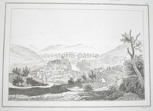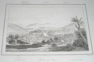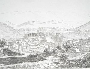 Interessante incisione antica e d'epoca raffigurante una veduta panoramica della nota località laziale. L'opera illustra con precisione la struttura urbanistica, i palazzi e i monumenti della metà dell'Ottocento.