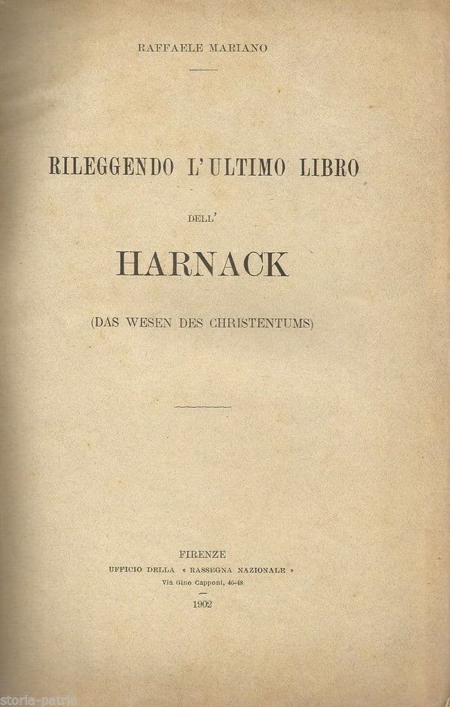 Raffaele Mariano Rileggendo l'ultimo libro dell'Harnack *(Das Wesen des Christentums)* Firenze, Rassegna Nazionale, 1902 (in copertina e frontespizio) Cm. 23, pp. 60, bross. edit. (sciupata) Interessante edizione antica e d'epoca, specialistica dissertazione teologica filosofica relativa al volume dell'Harnack intitolato "L'Essenza del Cristianesimo", con trattazione ovviamente di impossibile sintesi, ma con capitoli su *Preludio e primi approcci* *Schema del libro e suoi concetti direttivi* *Esame e critica* *Incoerenza e contraddizioni* *Costruzione dell'Harnack antistorica* *L'esclusione dell'Evangelo di Giovanni* *L'interpretazione dei Sinottici contraria alla realtà* *Il Cristo non è uno dei maestri di morale* *Ammainando le vele* *L'Harnack e lo Zahn* *Libertà subiettiva di esame e critica* *I limiti e il criterio storico ed obiettivo della verità* Di interesse specialistico, filosofico, teologico, bibliografico *rara edizione originale, **due soli esemplari noti** nel sistema bibliotecario nazionale* Discreta conservazione generale, segni e difetti d'uso e d'epoca, sparse fioriture e bruniture diffuse, legatura allentata e parzialmente sciolta, copertine con rotture al dorso e macchie e difetti vari e annotazioni, pertanto esemplare eventualmente meritevole di rilegatura; la datazione in copertina e al frontespizio porta 1902, mentre al verso del frontespizio è indicato il nome dello stampatore Fiori (Pistoia) e la data 1903. *(l'immagine allegata raffigura un particolare del frontespizio, eventuali ulteriori informazioni a richiesta)*
