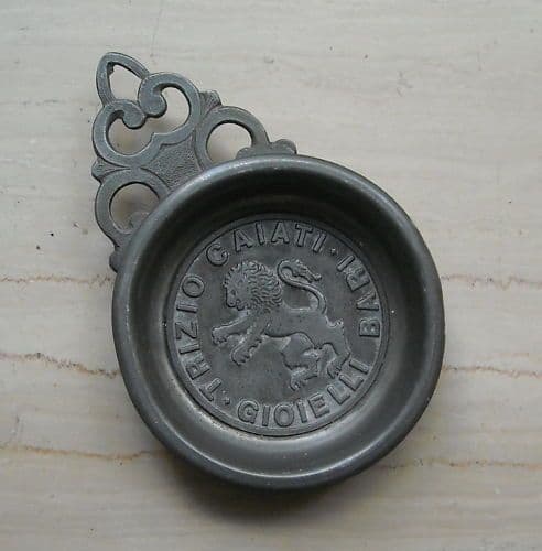 Trizio Caiati Gioielli Bari Interessante vecchia pubblicitaria, relativa alla nota oreficeria e gioielleria pugliese, piccola scodella forse ad uso posacenere, raffigurante al centro un leone rampante; esemplare in peltro, prodotto dalle "Creazioni Trica", così come ma marchio impresso al verso dell'oggetto; misura circa cm. 7,5 (diametro della parte circolare; circa cm. 1,5 altezza; circa cm. 11,5 lunghezza totale compreso l'artistico manico traforato pure in peltro); oggetto databile alla seconda metà del '900, forse anni '70 (?) Di interesse storico-locale, pubblicitario, collezionistico Buona conservazione generale, usuali segni e difetti d'uso o d'epoca.
