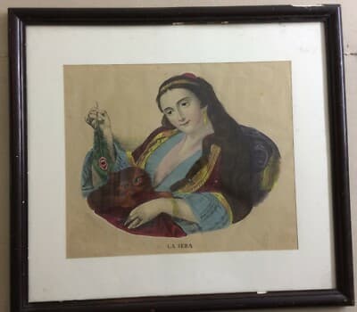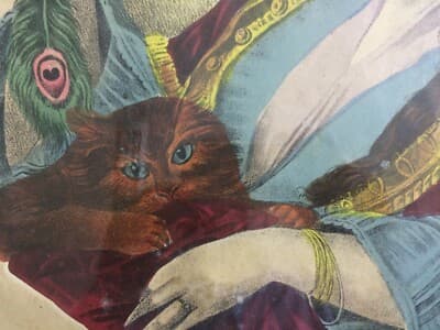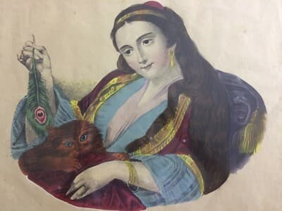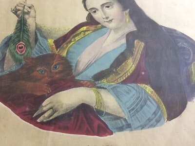 La Sera: Antica Allegoria Artistica. Donna Con Piuma E Gatto, Litografia Colorata Del XIX Secolo