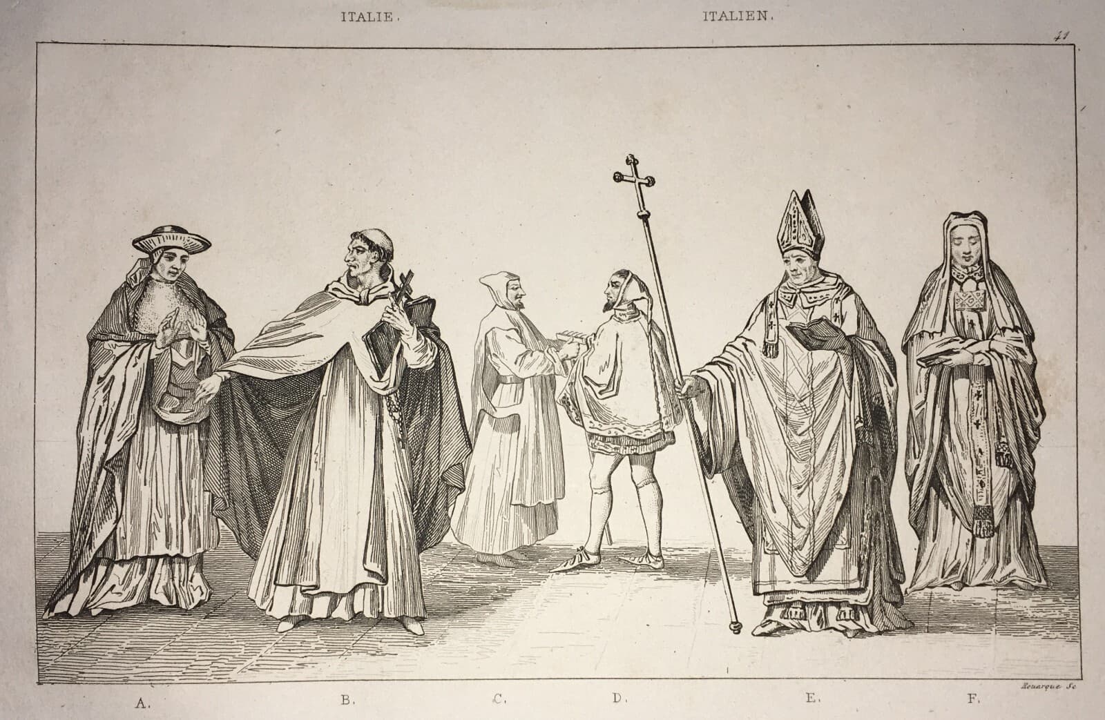 Costumi Italiani: Religiosi, Frate, Vescovo. Antica Incisione Rouargue, XIX Secolo