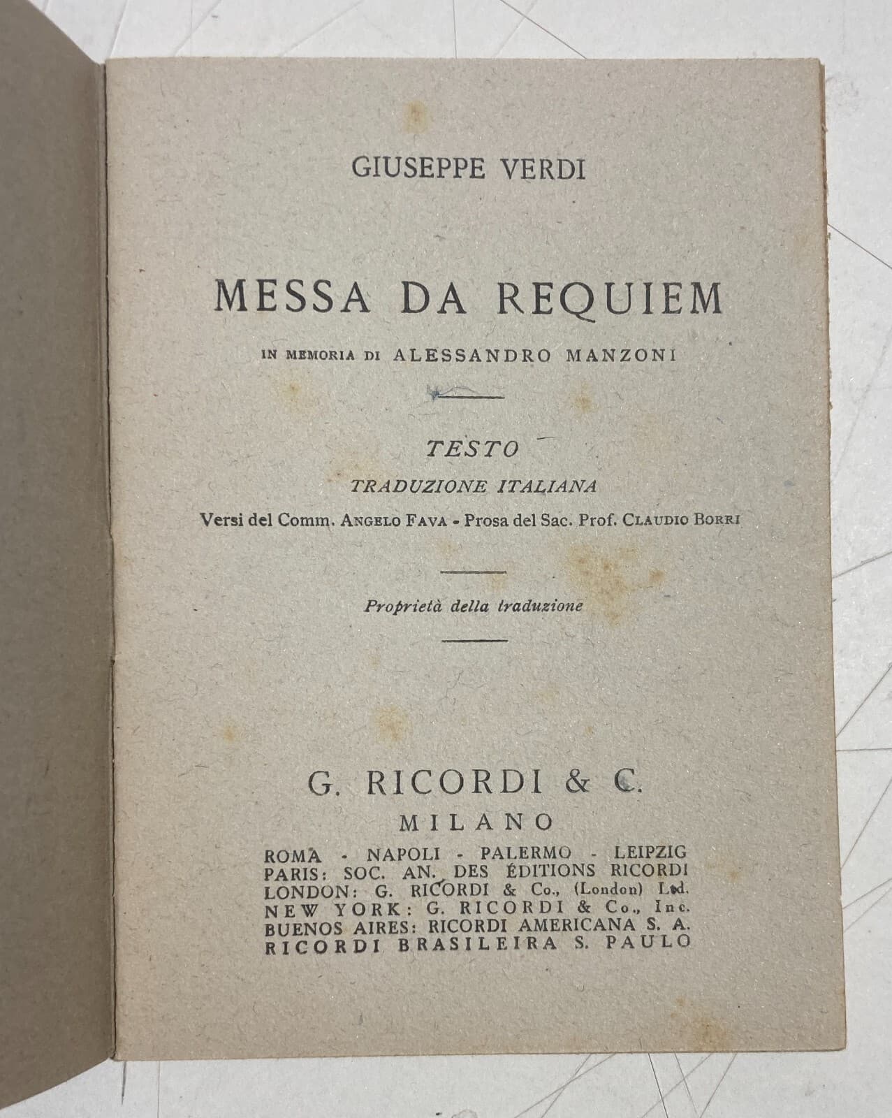Teatro E Musica: Giuseppe Verdi, Alessandro Manzoni, Messa Da Requiem Edizione Ricordi, Milano