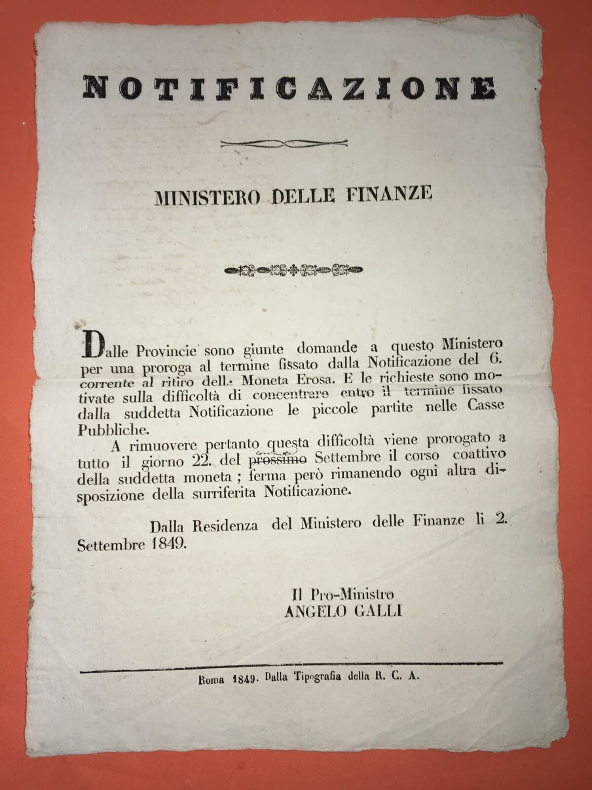 Numismatica: Moneta Erosa, Antico Foglio Volante Di Angelo Galli, Roma, 1849