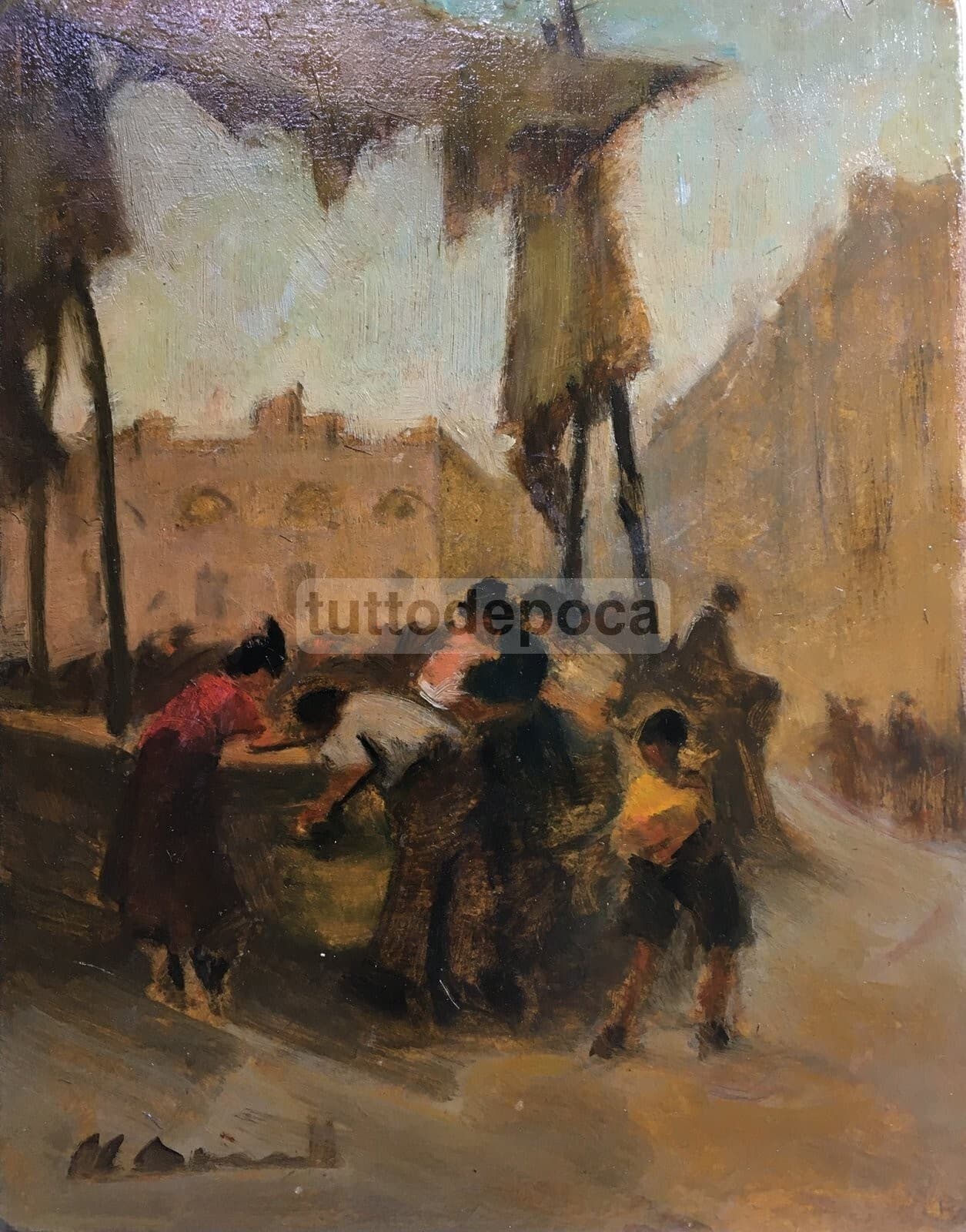 Mario Spinelli (attr.) Veduta Di Piazza Con Mercato Dipinto A Olio Su Faesite